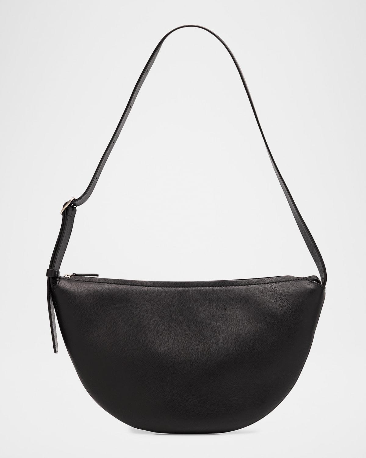 THE ROW "Jouvette" crescentshaped shoulder bag crafted in finely grained calfskin leather Adjustable crossbody strap Zip top closure Lambskin leather lining Approx. 8"H x 13.5"W x 1.5"D Made in Italy