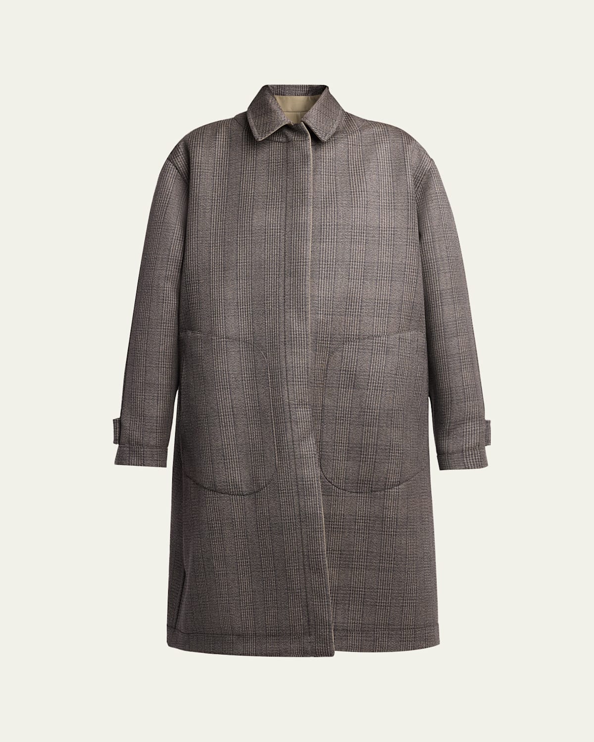 THE ROW "Palomar" reverses to a wool check Point collar with throat latch; concealed button front Long sleeves; buttontab cuffs Hip patch pockets Straight fit Hem falls below the knee Walking vent back Virgin wool/silk Made in Italy