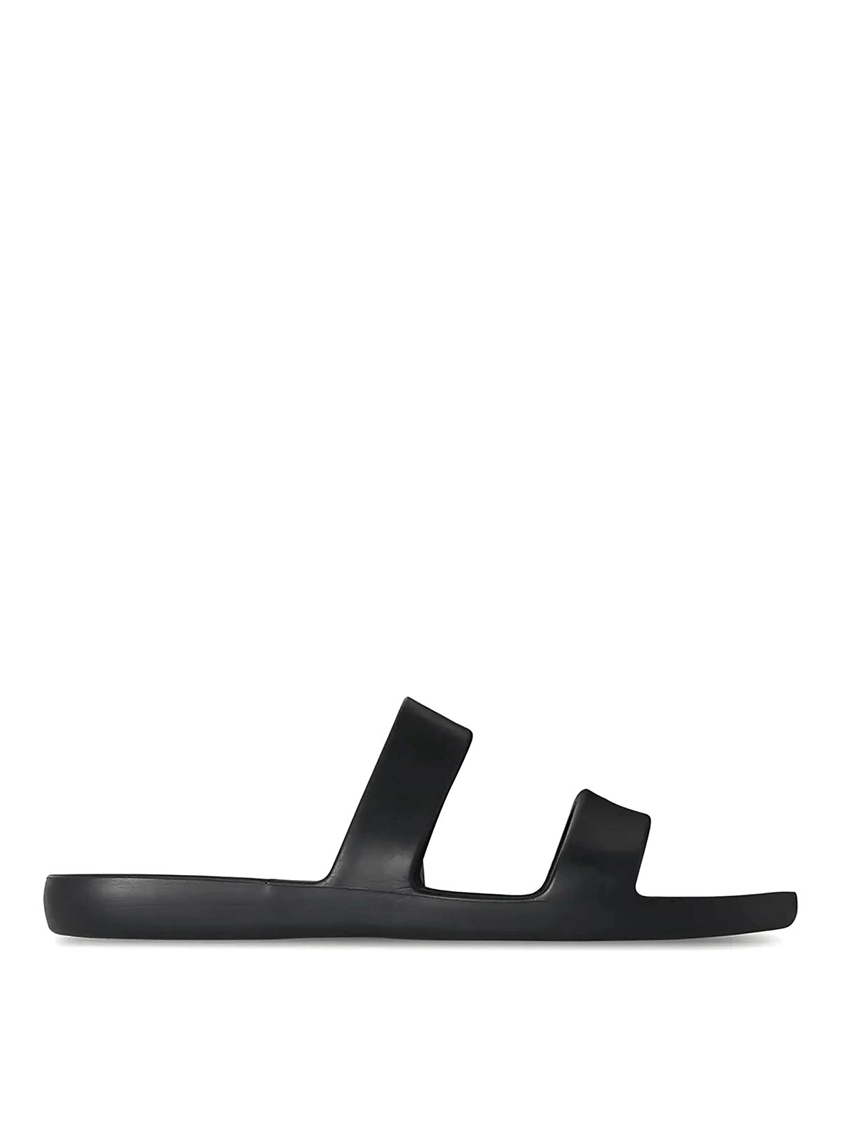 couleur design: noir, caoutchouc, design sans couture, doubles bretelles, bout rond ouvert, style à enfiler, assise plantaire de marque.