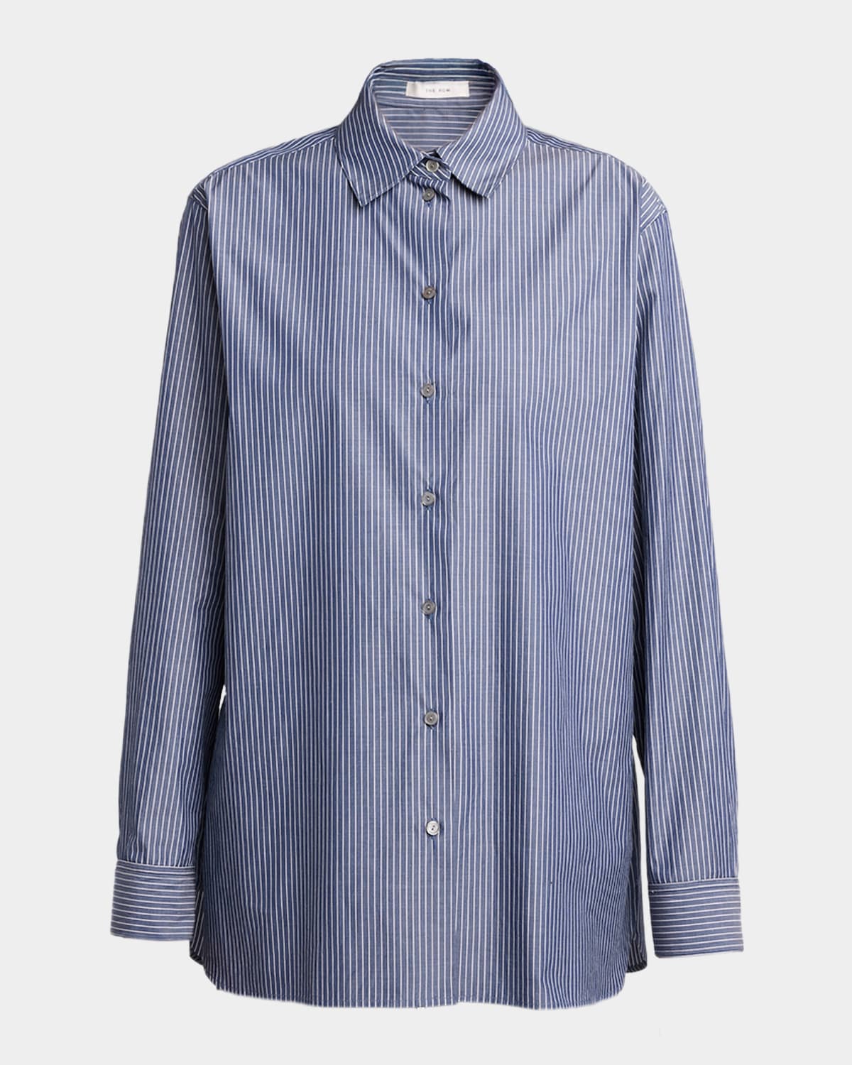 THE ROW "Sisilia" shirt is crafted of cotton popline with a striped print and adorned with motherofpearl buttons Point collar; button front Long sleeves; button cuffs Loose fit Hem falls below the hip Straight hem Cotton/motherofpearl Made in Italy