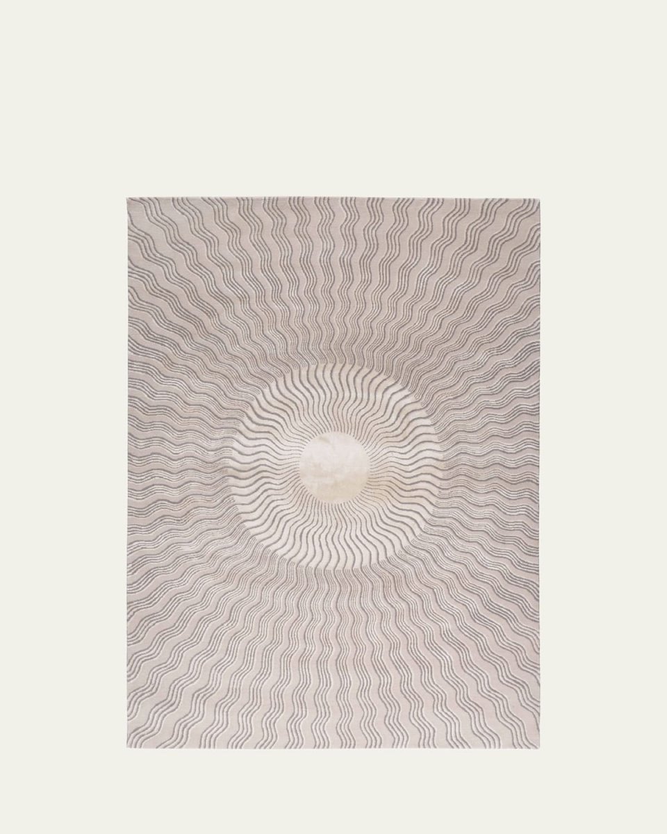 Sunray Nude depicts a dramatic silk sun motif, with the metallic rays beginning at the center of the rug and stretching to its edges. The warm neutral and cool grey yarns combine to create a radiating dazzling light, adding warmth and depth to any interior space. Handcrafted of Tibetan wool and silk 150 knots per square inch Cut pile Item Weight (Lbs.): 75.0 Vacuum regularly; professional clean only Size is approximate; we recommend use of a rug pad (not included) Imported