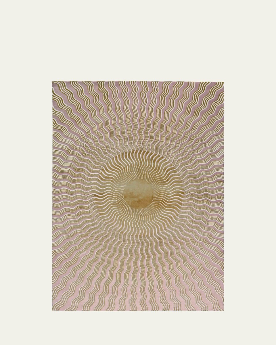 Handknotted in a delicate palette of powder pinks and warm neutrals, Sunray Pink depicts a dramatic silk sun motif, with the metallic rays beginning at the center of the rug and stretching to its edges. The design radiates a dazzling light, transforming any space, and is inspired by the art of enamel. Handcrafted of Tibetan wool and silk 150 knots per square inch Cut pile Item Weight (Lbs.): 75.0 Vacuum regularly; professional clean only Size is approximate; we recommend use of a rug pad (not included) Imported