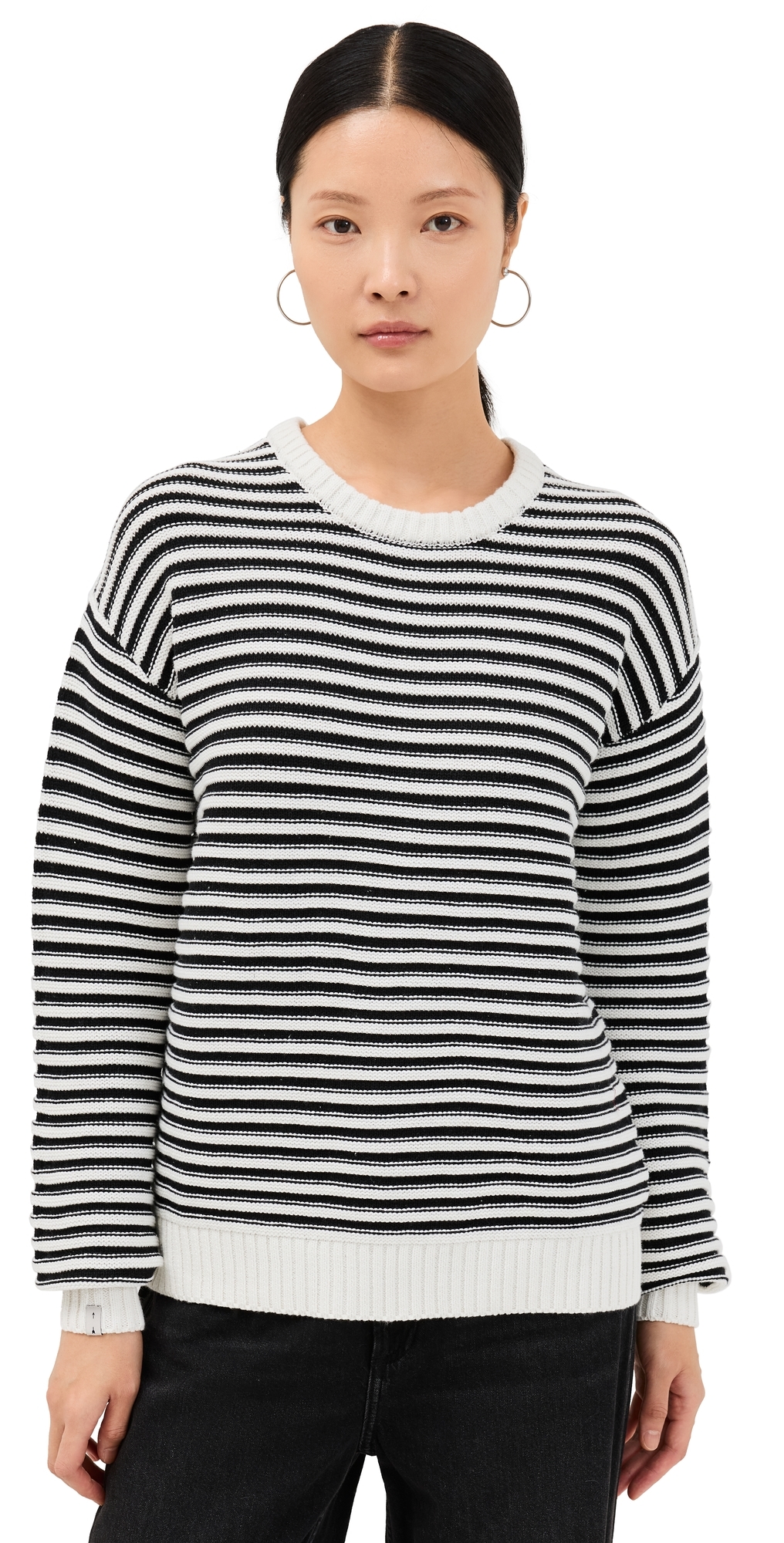 Fabric: Mid-weight knit. Striped pattern. Ribbed trim. Crew neck. Long sleeves with dropped shoulders. Shell: 100% cotton. Wash cold. Imported, China. Measurements: Measurements from size S Length: 24.5in / 62.0cm, from shoulder
