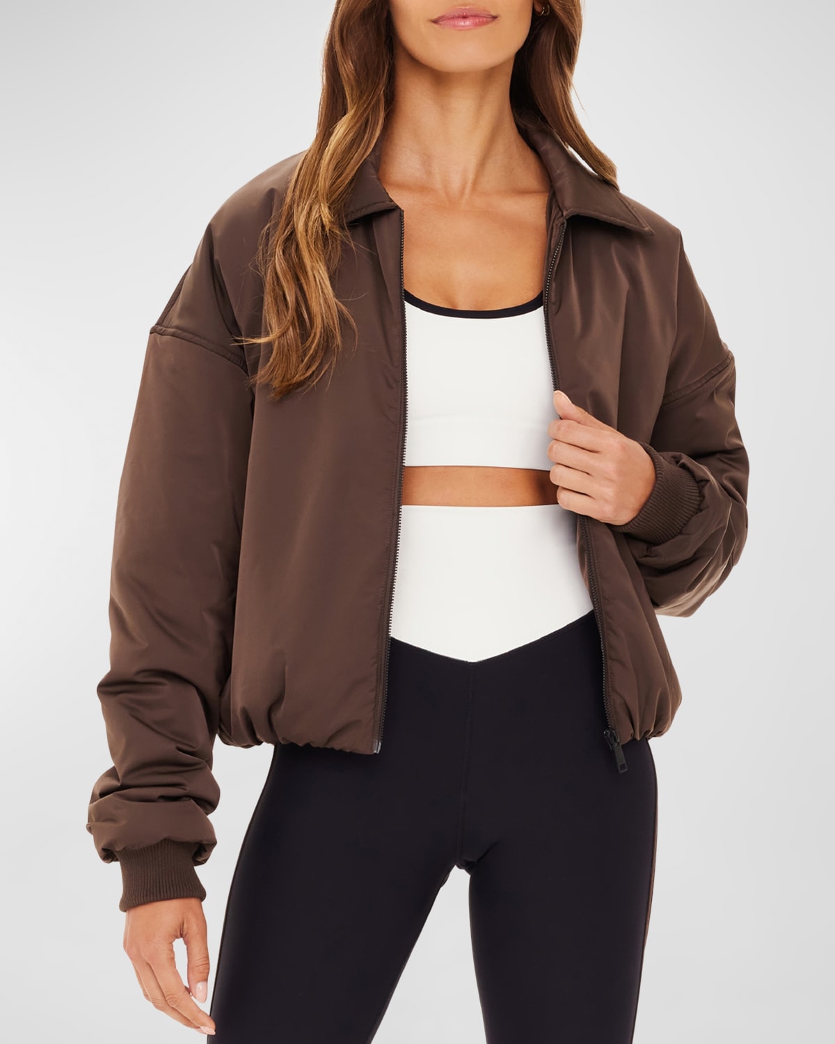 The Upside "Carlotta" bomber jacket Approx. 22.2"L from shoulder to hem Baseball collar; front zip Dropped shoulders Long sleeves Side seam pockets Cropped hem Banded cuffs and hem Polyester Imported