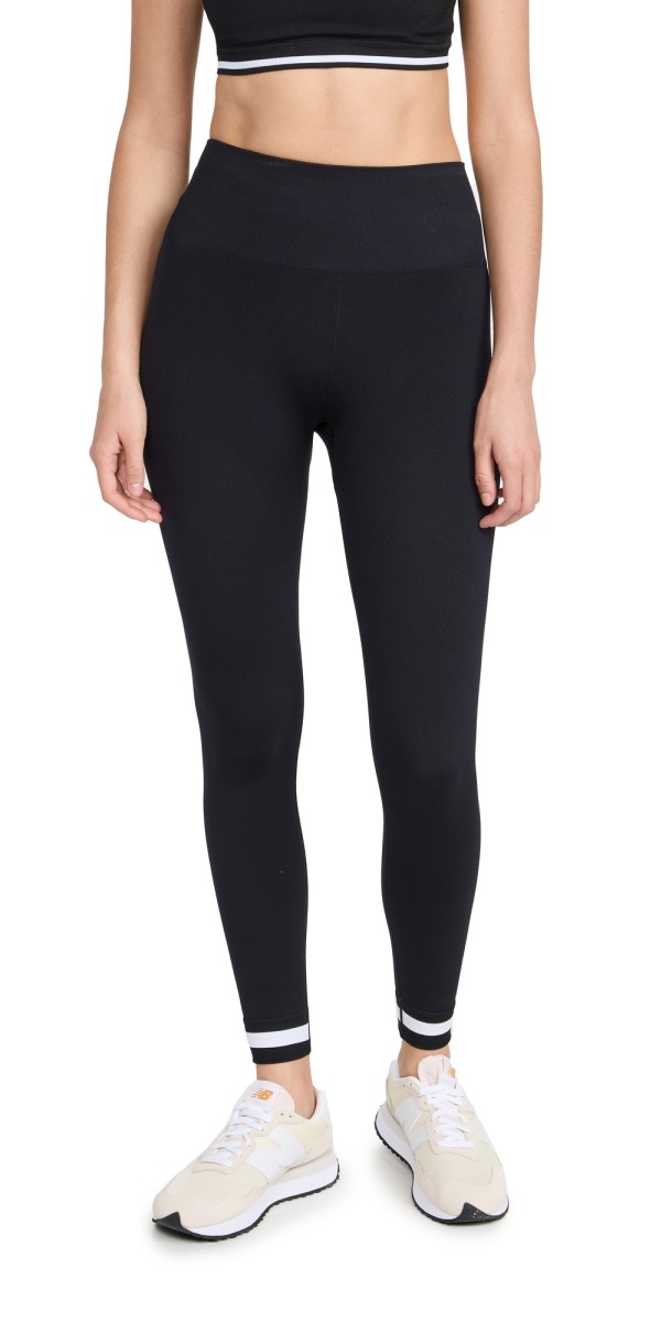 Fabric: Mid-weight jersey. Designed for low impact workouts like yoga. High-rise, double-layered waistband. Striped and ribbed trim. Shell: 85% polyamide/15% elastane. Wash cold. Imported, China. Measurements: Measurements from size S Rise: 8.25in / 21cm Inseam: 22in / 56cm