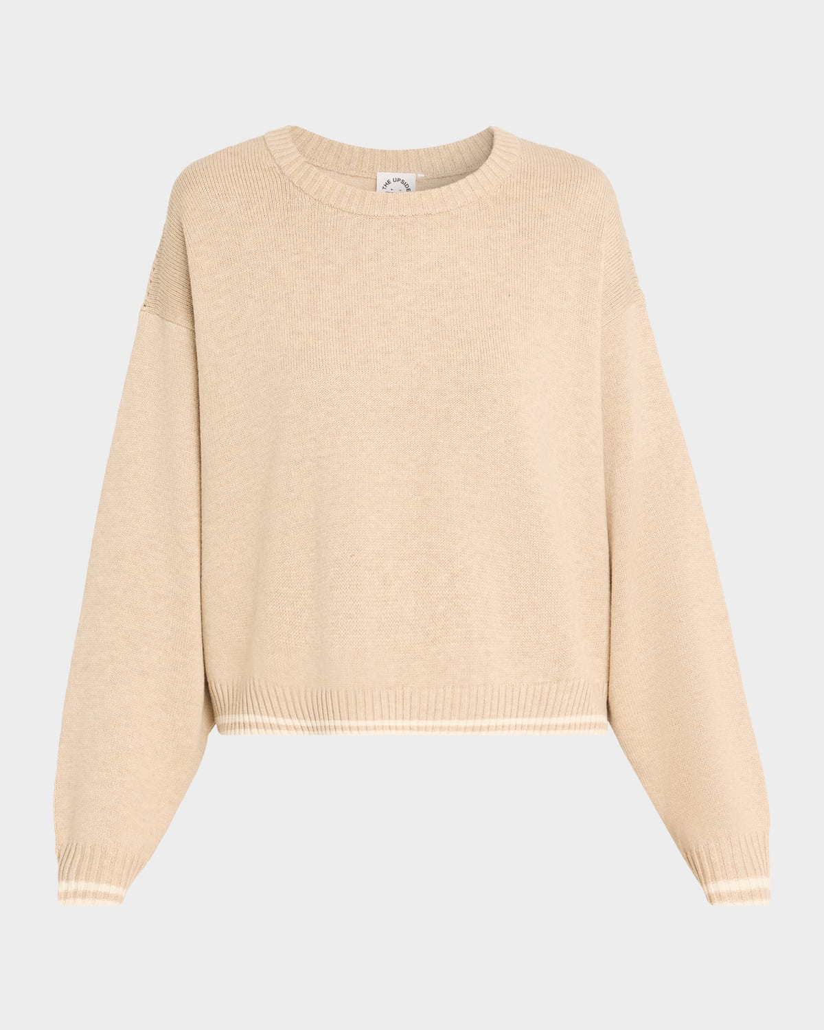 Crafted from a cozy blend of wool and cotton for a relaxed fit, the "Xanthe" sweater by The Upside features textural knit detailing through the shoulders and contrasting stripes along the cuffs and hem Approx. 27"L from shoulder to hem Crew neckline Dropped shoulders Long sleeves; approx. 21"L Hip length Ribbed cuffs and hem Pullover style Wool/cotton Machine wash cold, gentle cycle, do not tumble dry or dry clean Imported