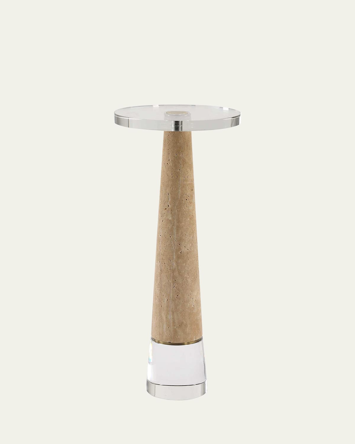 This tapered drink table pairs the sophisticated beauty of natural materials with the elegance of crystal for a contemporary piece that fits into any decor style. Handcrafted of crystal, travertine, and steel Overall, approx. 9"Dia. x 24"T Wipe clean Weight, 22.0 lbs Imported Boxed weight, approximately 27.0 lbs
