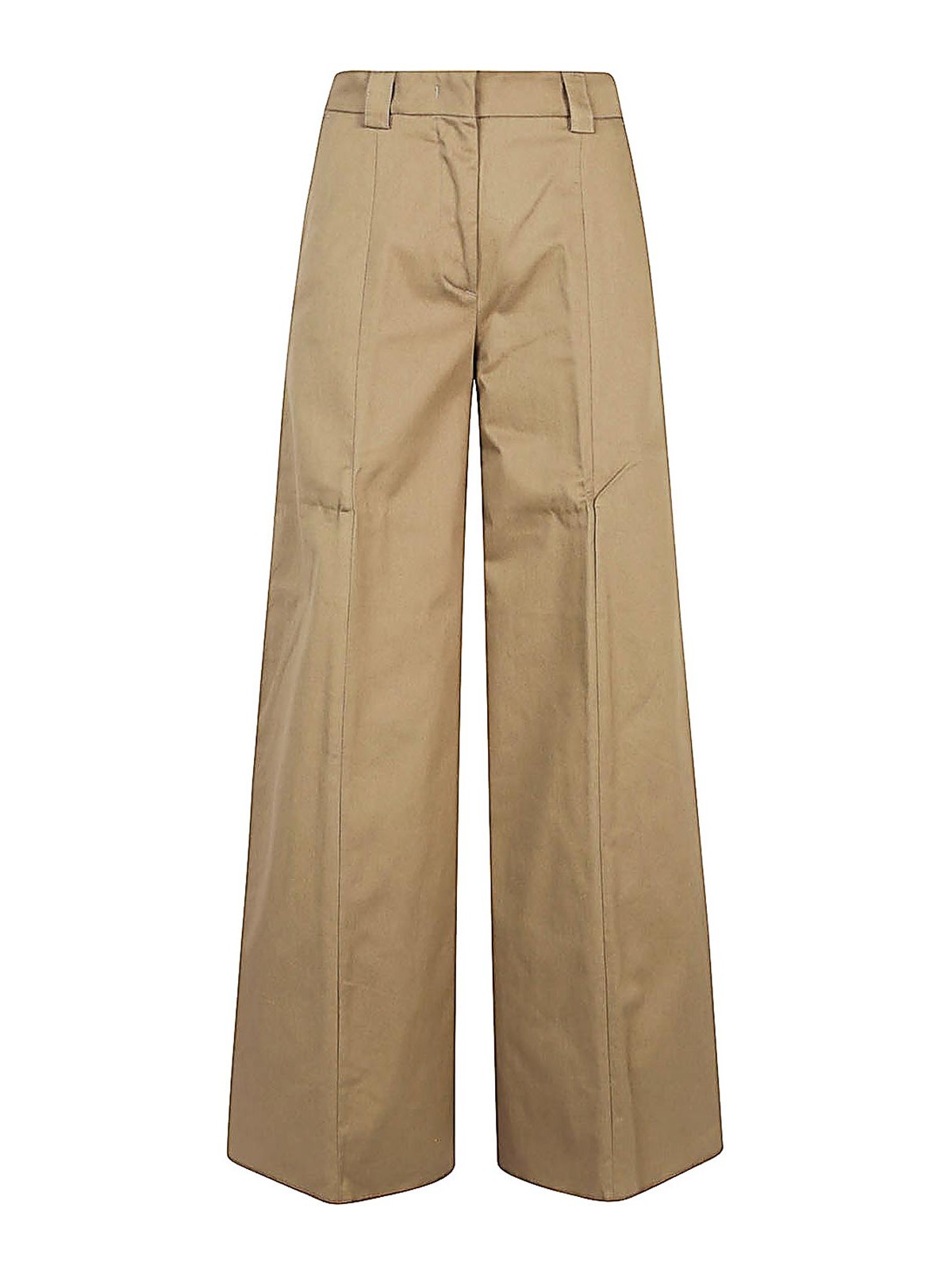Pantalon vert, dessus, taille haute, fermeture boutonnée et zippée, passant de ceinture, jambe large.