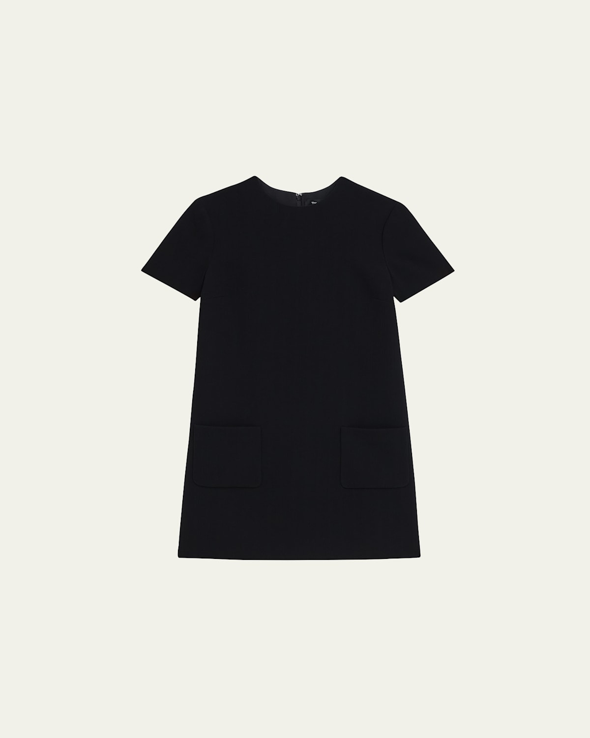 Theory classic aline shift dress with front patch pockets Approx. 32.5"L from shoulder to hem Round neckline Short sleeves; approx. 15.0"L Hem falls above the knee Shift silhouette Invisible back zip fastening Triacetate/polyester Dry clean Imported