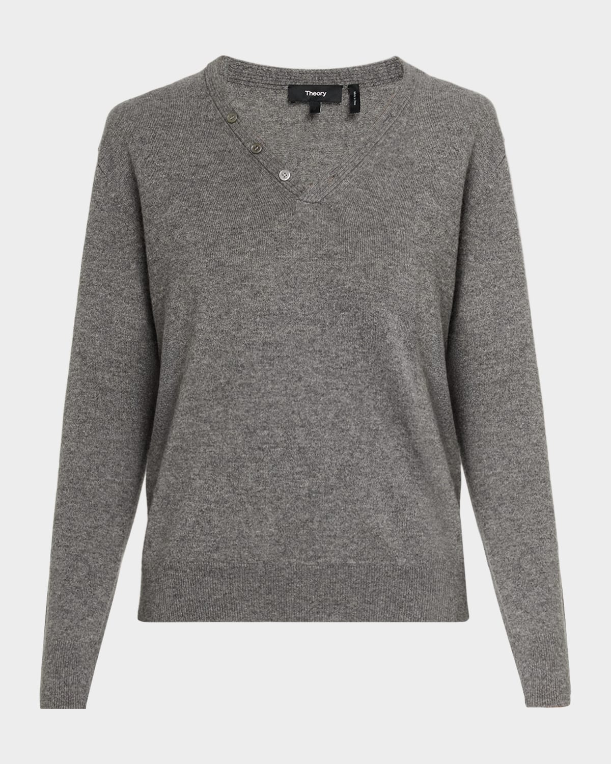 Luxurious cashmere sweater with tonal buttons by Theory. V neckline Dropped shoulders Long sleeves Relaxed fit Hem falls to the hip Pullover style Cashmere Dry clean Imported