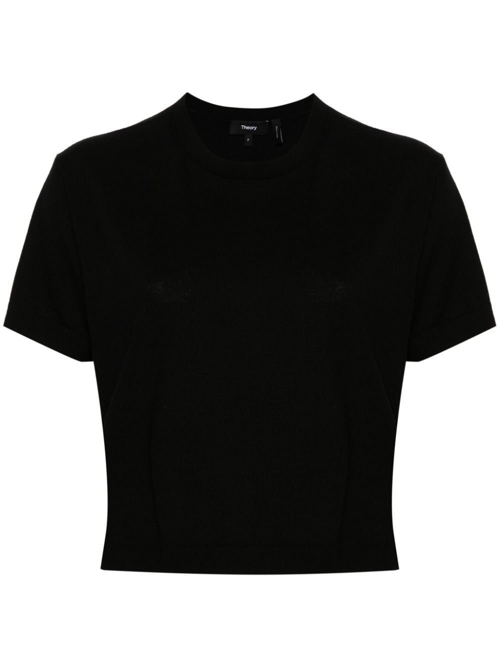 black merino wool fine knit cropped crew neck short sleeves ribbed cuffs and hem straight hem