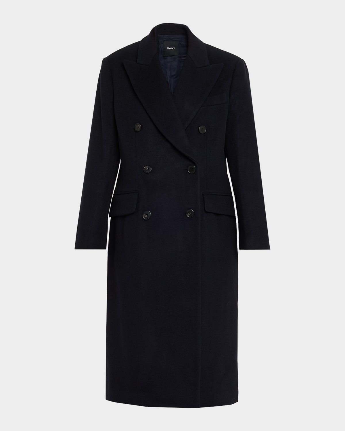 Crafted of a wool blend, this Theory coat is designed with a doublebreasted front for a sleek, longline silhouette. Peak lapels Long sleeves with button cuffs Chest welt pocket Side flap pockets Classic fit Vented back Buttonfront Virgin wool/nylon/cashmere Dry clean Imported