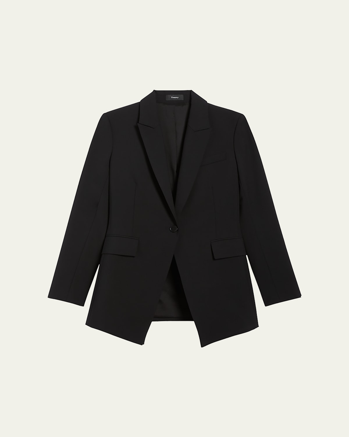 Theory "Etiennette" blazer in Good Wool suiting. Notched collar; onebutton front. Long sleeves with button cuffs. Side flap pockets. Tailored silhouette. Cutaway hem. Wool/spandex. Imported.