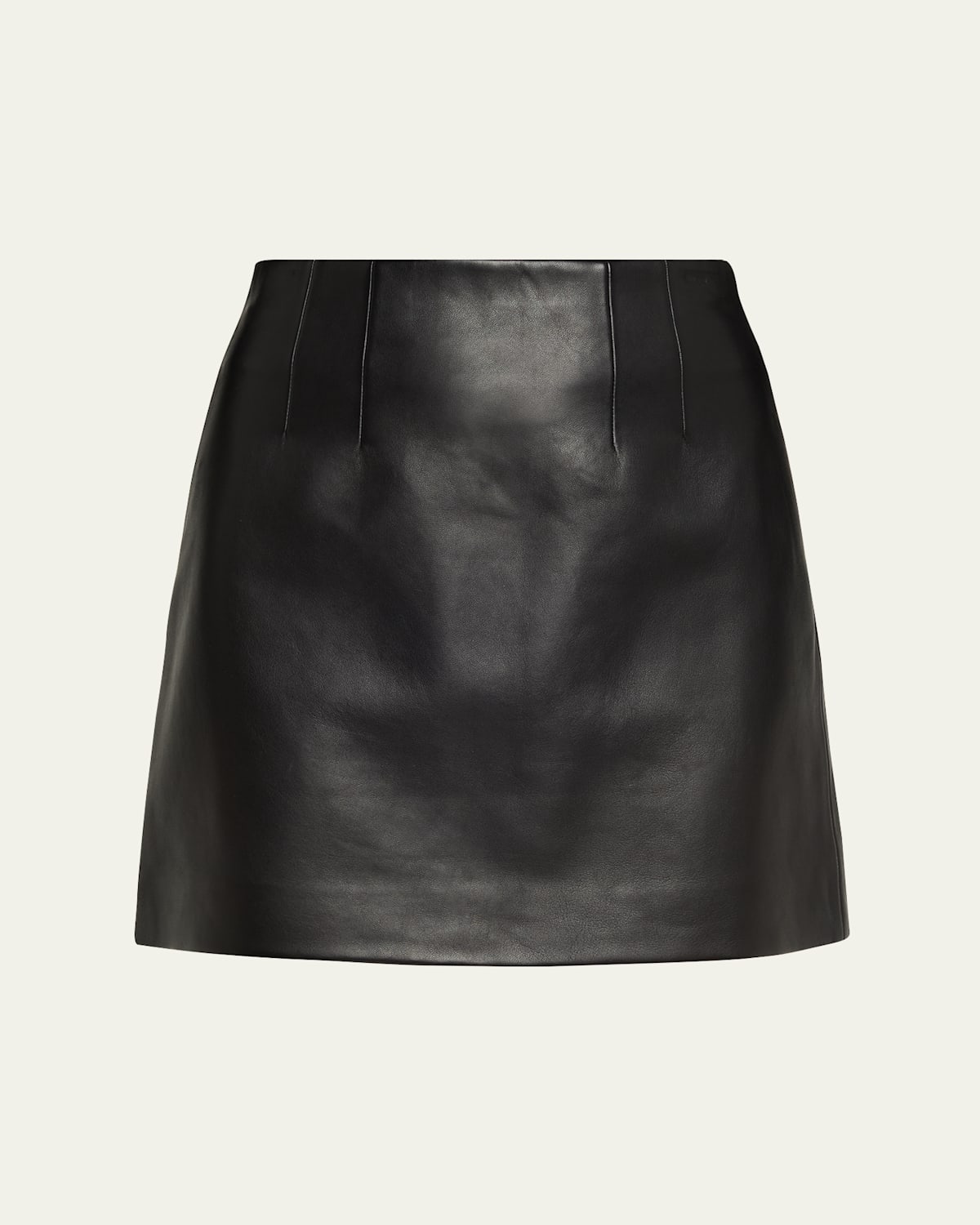 Supple lambskin leather mini skirt by Theory. High rise Waist dart detailing Aline silhouette Hem falls above the knee Side zip closure Leather Leather method dry cleaning Imported