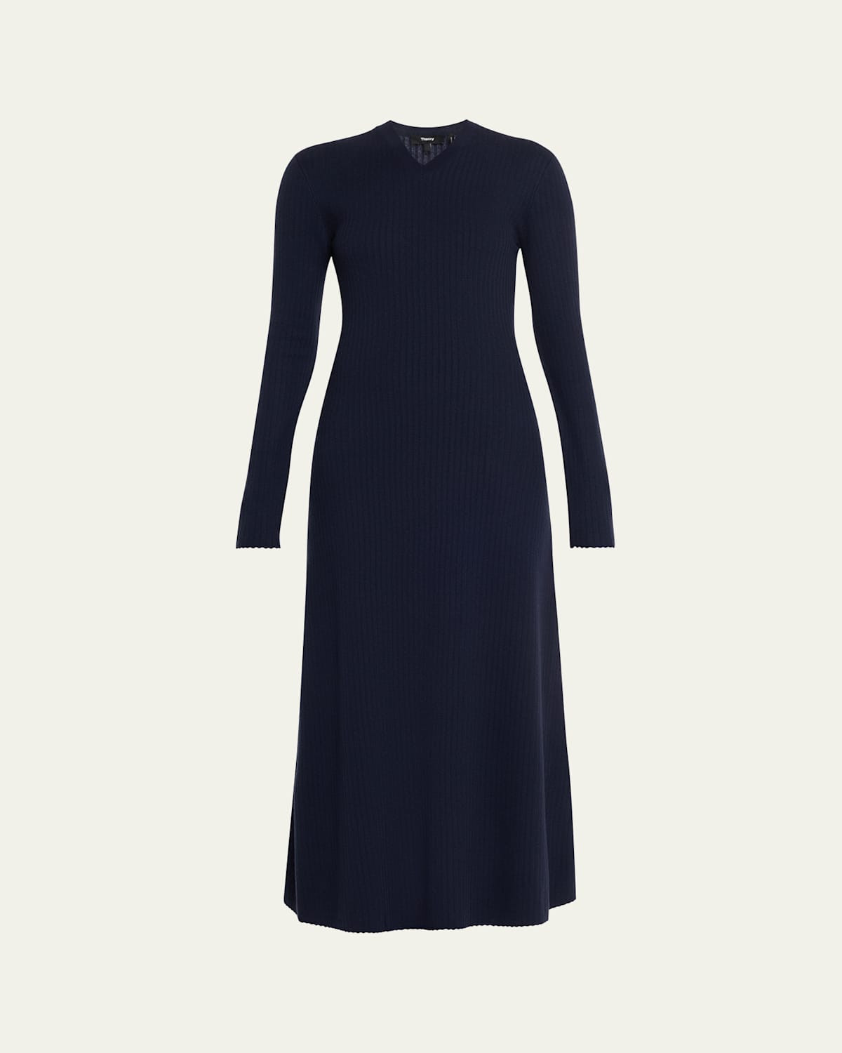 Ribbed Regal Wool dress by Theory. High V neckline Long sleeves Easy silhouette Full length Slipover style Merino wool Dry clean Imported