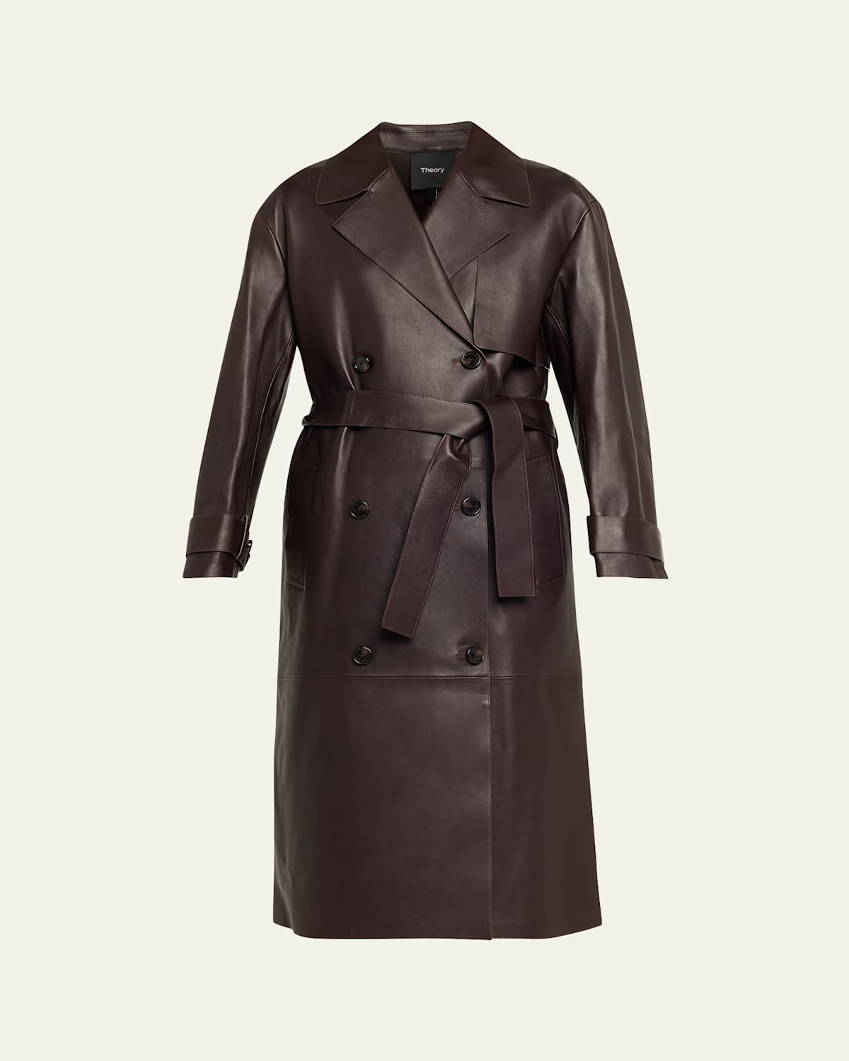 Crafted in smooth lambskin leather, this trench coat by Theory features a selftie belt to accent its sleek, timeless silhouette. Notch lapels Doublebreasted front Storm flap Long sleeves with belted cuffs Side pockets Oversized fit Walking vent Buttonfront Leather Professional cleaning recommended Imported