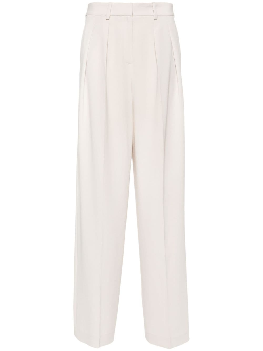 ecru crepe texture high waist belt loops two diagonal pockets to the sides pleat detailing wide leg rear button-fastening pocket concealed front button, hook and zip fastening