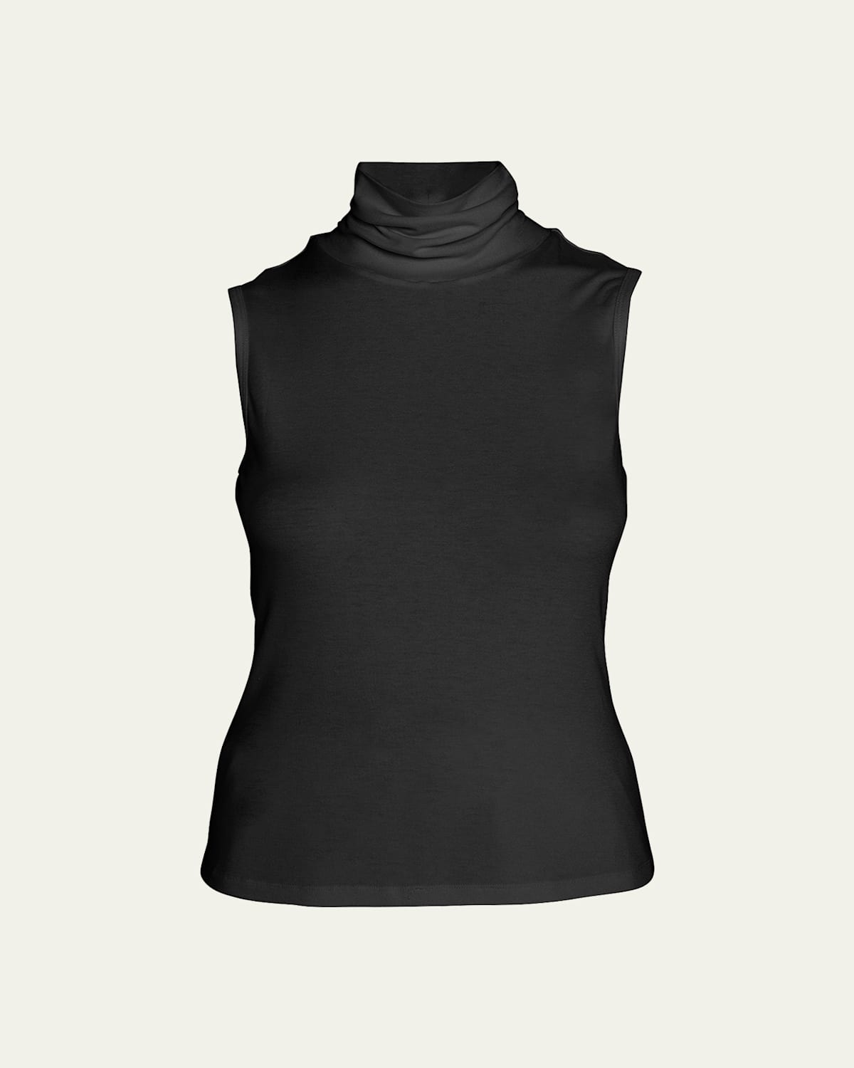 Theory stretchy crepe top boasts ribbed construction Turtleneck Sleeveless Slim fit Hip length Pullover style Viscose/polyurethane Made in USA