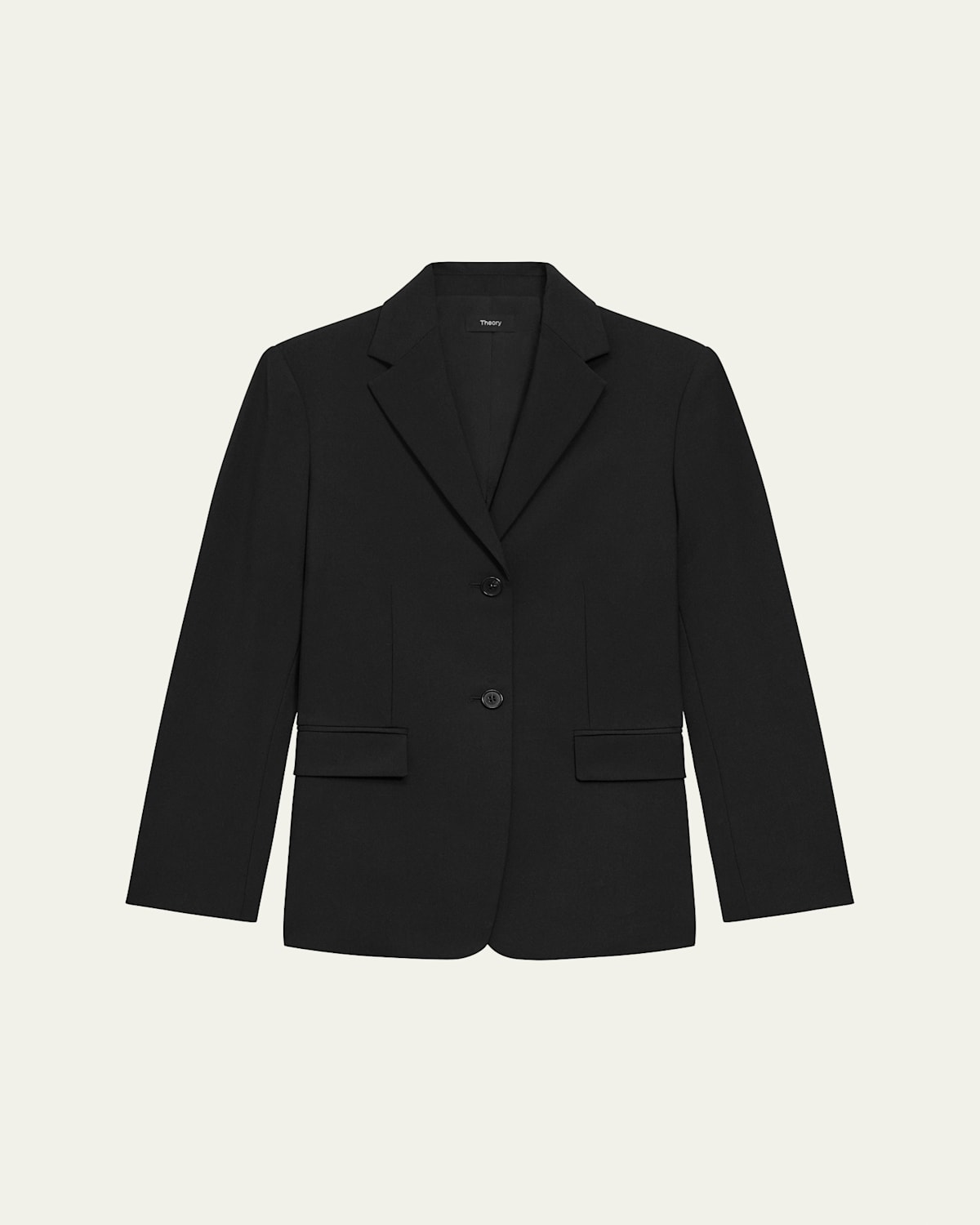 Theory clean blazer with a threebutton cuff finish Notched lapels; twobutton front Long sleeves Front flap pockets Cutaway hem Tailored fit Wool/elastane Dry clean Imported