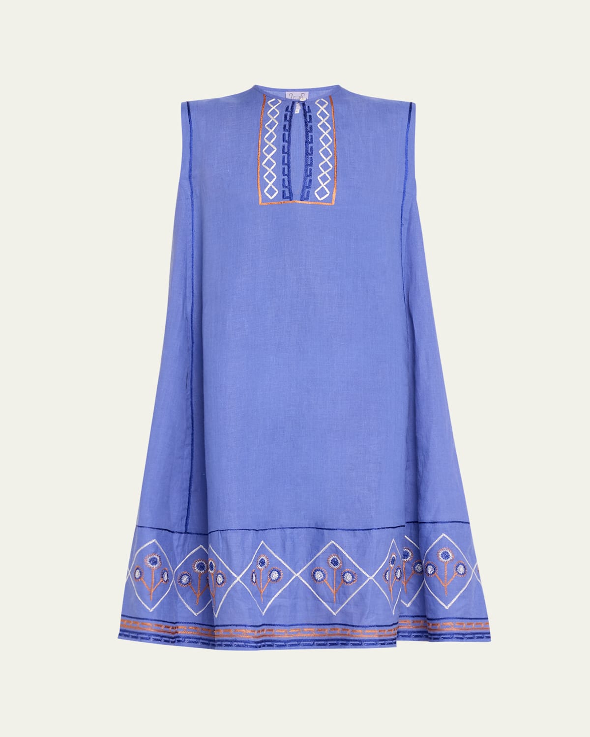 Thierry Colson "Apolonia" dress features contrasting embroidery Round neckline; optional button/loop closure Sleeveless Hem falls below the knee Aline silhouette Slipover style Linen Imported