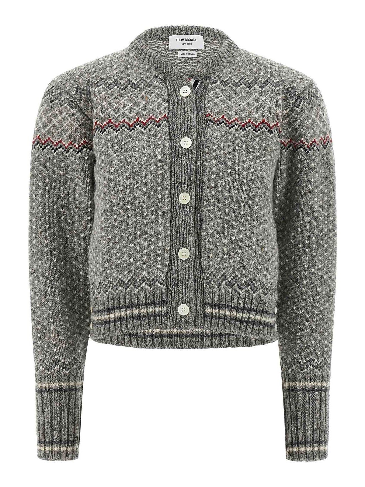 Cardigan en maille « flottante » Fairisle avec col rond et boutons, manches longues avec poignets et épaules tombantes, fentes latérales boutonnées et ruban côtelé en gros-grain
