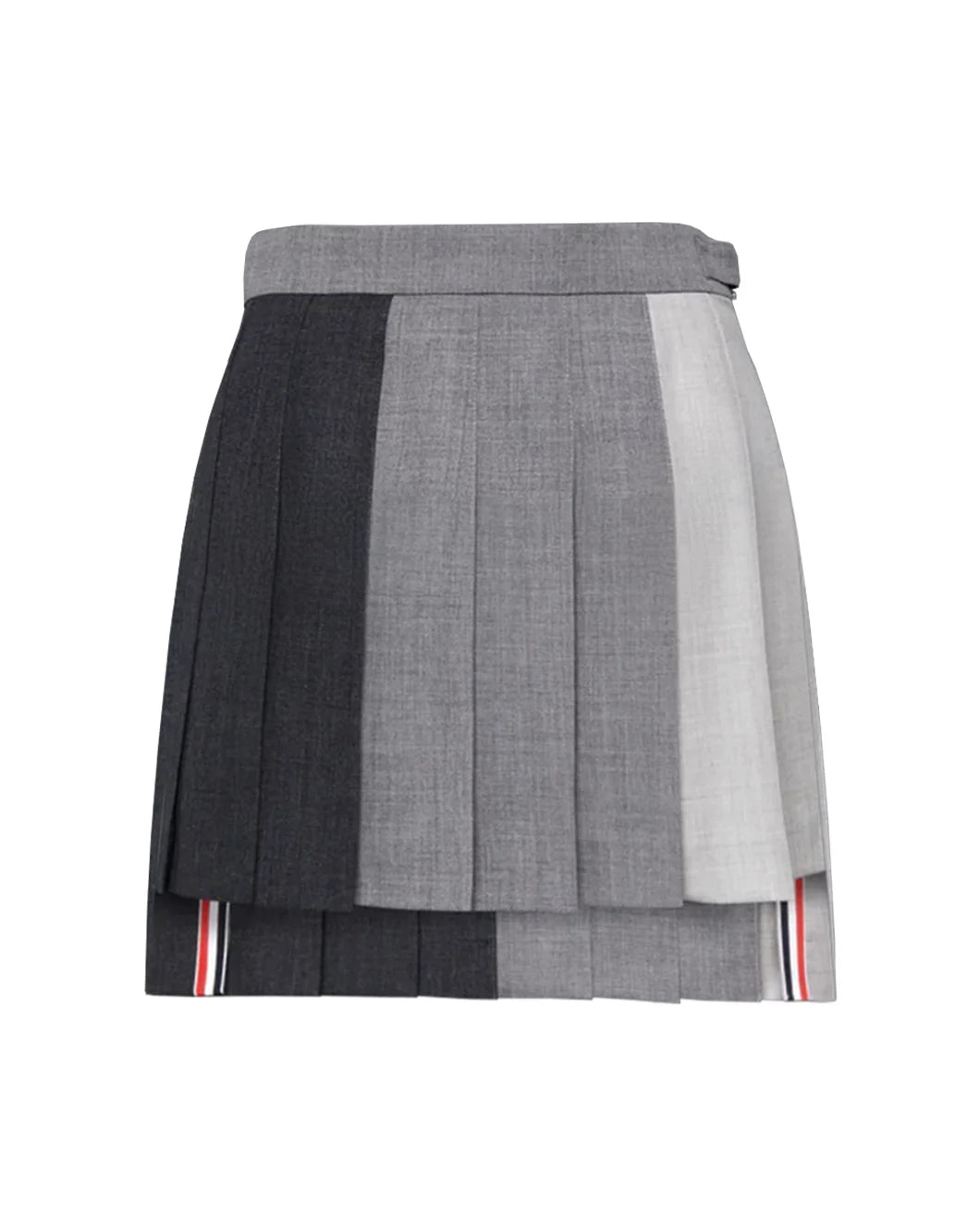 The Funmix Wool Fresco Classic Mini Pleated Skirt by Thom Browne is a striking mini crafted in three shade of color contrast with Browne's signature grosgrain trim. A dropped back hem adds striking interest to this classic silhouette. Model is 5' 10" (178cm), wearing size 40 100% Wool Combo2: 100% Wool Lining: 100% Cupro Made in Italy FGC789F-00473-025