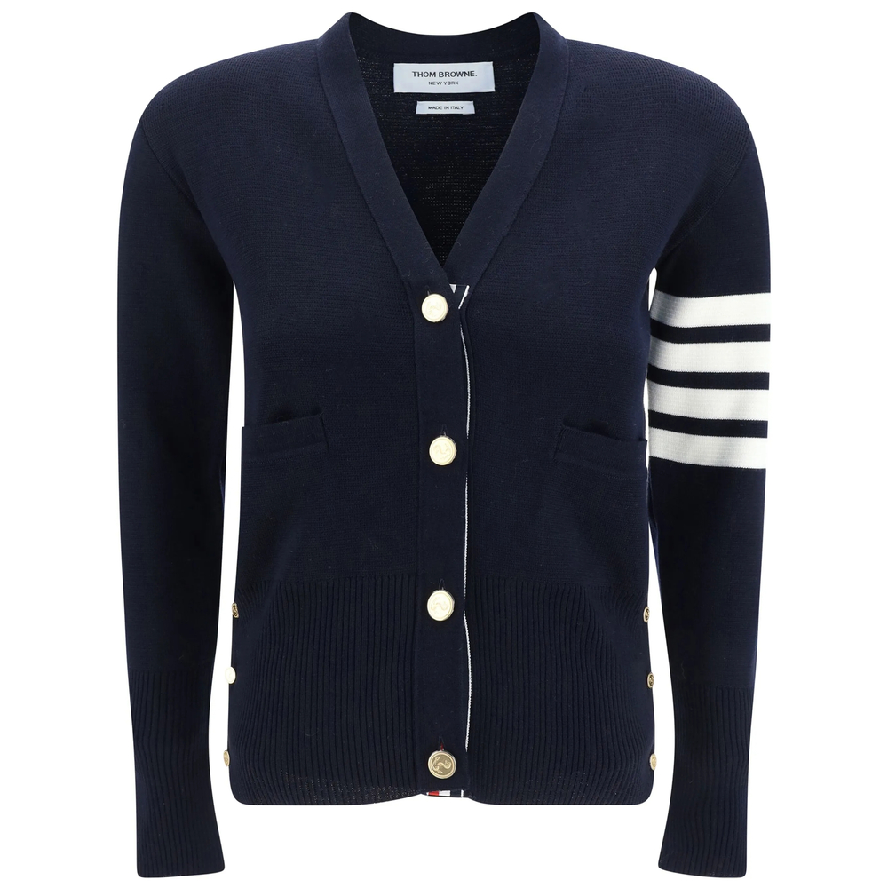Is preppy style right up your street? Then you'll want to follow the map to this 4-Bar stripe cardigan from Thom Browne. X marks the spot! Featuring a v-neck, a front button fastening, long sleeves, two front pockets, button cuffs, a ribbed hem and cuffs, a side button fastening, a signature grosgrain loop tab, RWB details and a 4-Bar stripe.