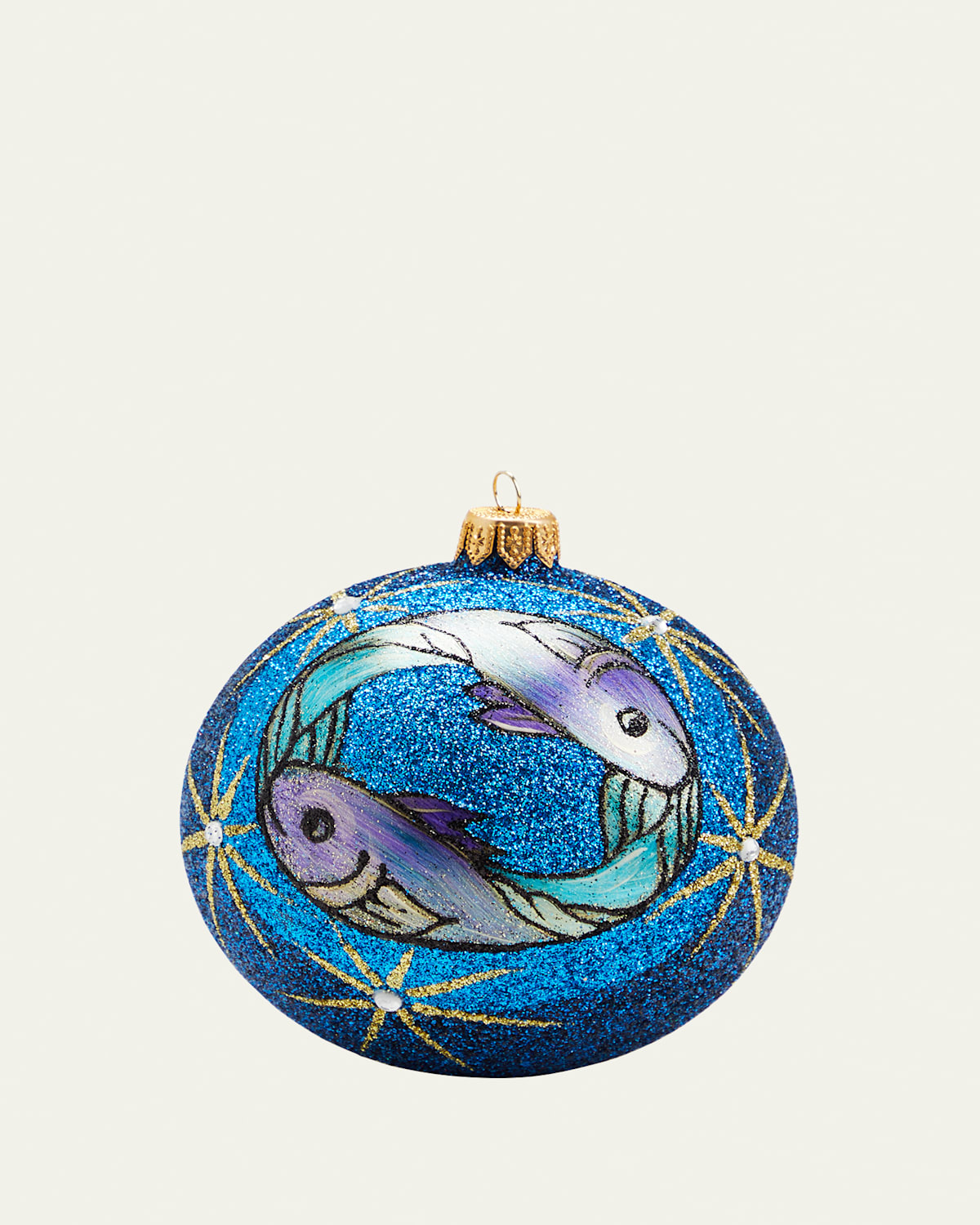 Christmas ornament depicts an interpretation of the Pisces zodiac sign on the front with the name on the back Handcrafted of glass and covered in glitter Approx. 3"Dia. x 3"T Made in Poland