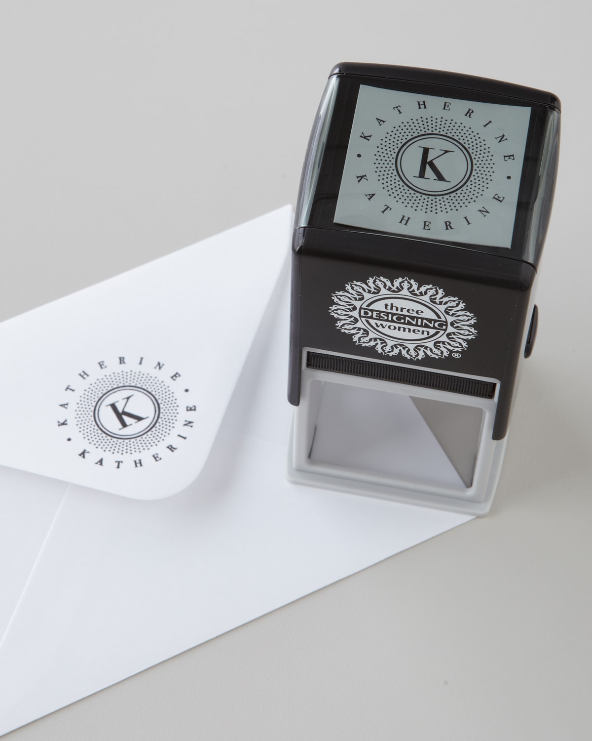 Custom stamp includes a black ink pad. Round name and initial stamp. Specify one initial and up to 18 characters/spaces for name. Imported.