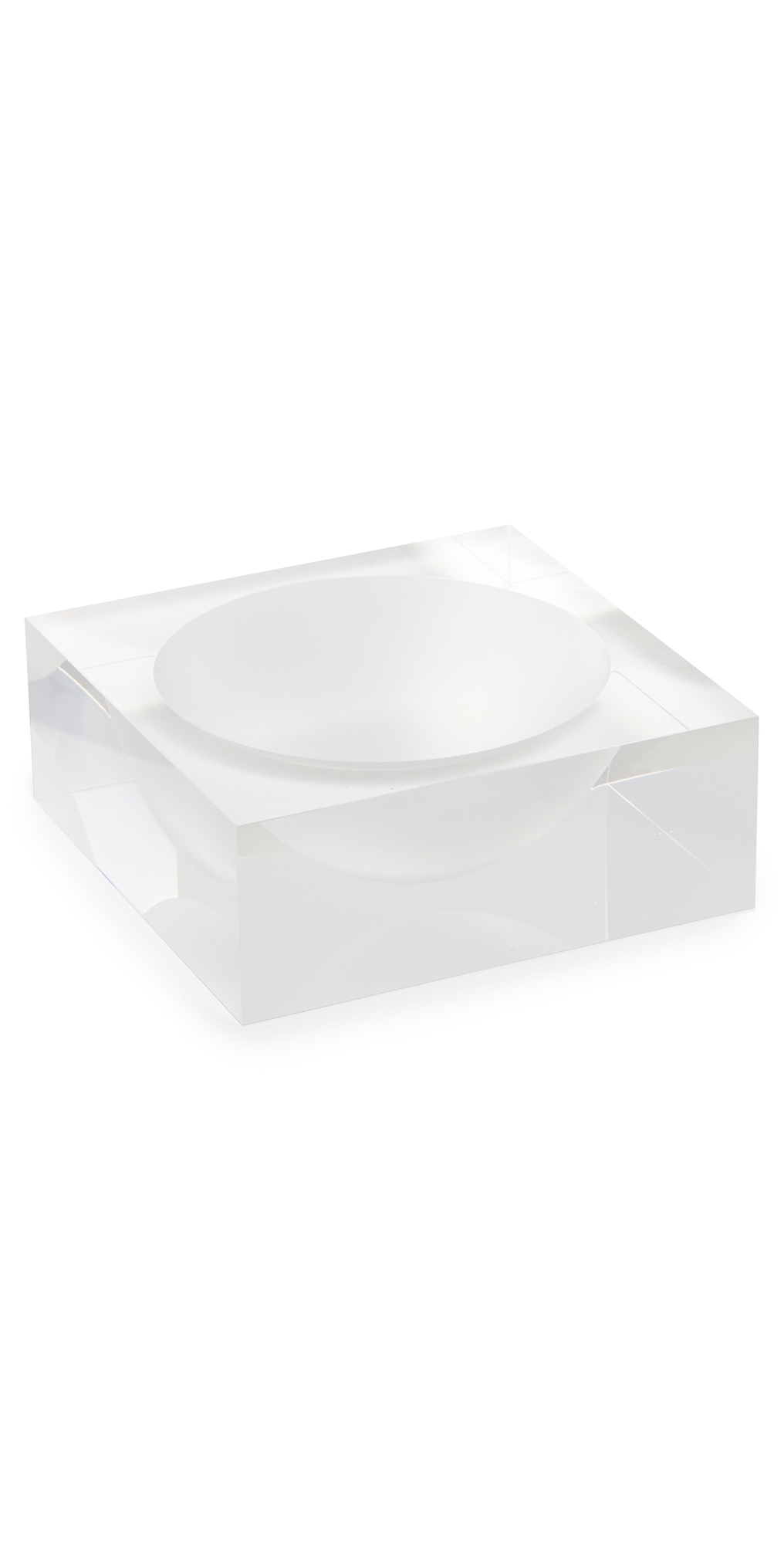 Clear lucite. Frosted bowl. Imported, Taiwan. Measurements: Width: 6in / 15cm Length: 6in / 15cm Depth: 2.25in / 6cm Diameter: 5in / 12.5cm