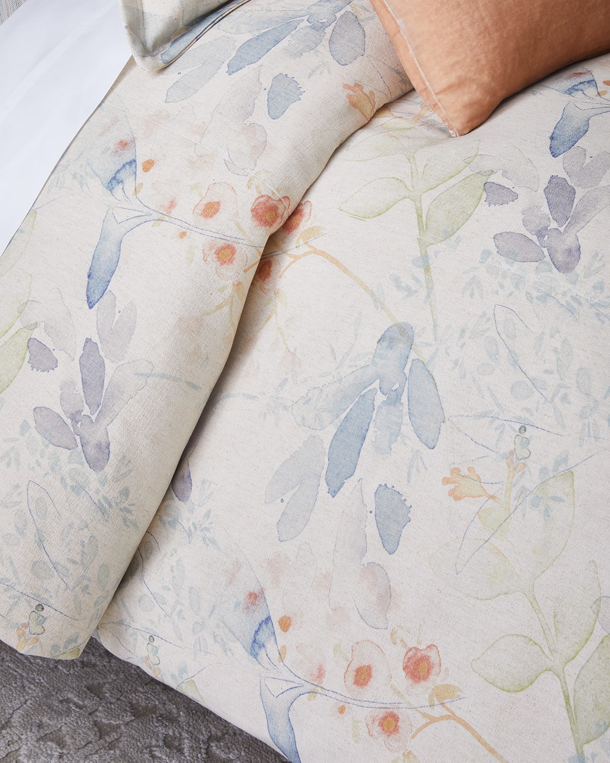 Handcrafted duvet cover features wonderful abstract vegetation watercolor illustration Reverses to ivory percale Made of polyester, cotton, and rayon For indoor use Approx. 91"L x 95.0"W Item Weight (Lbs.): 4.0 Machine wash cold Made in USA from imported materials