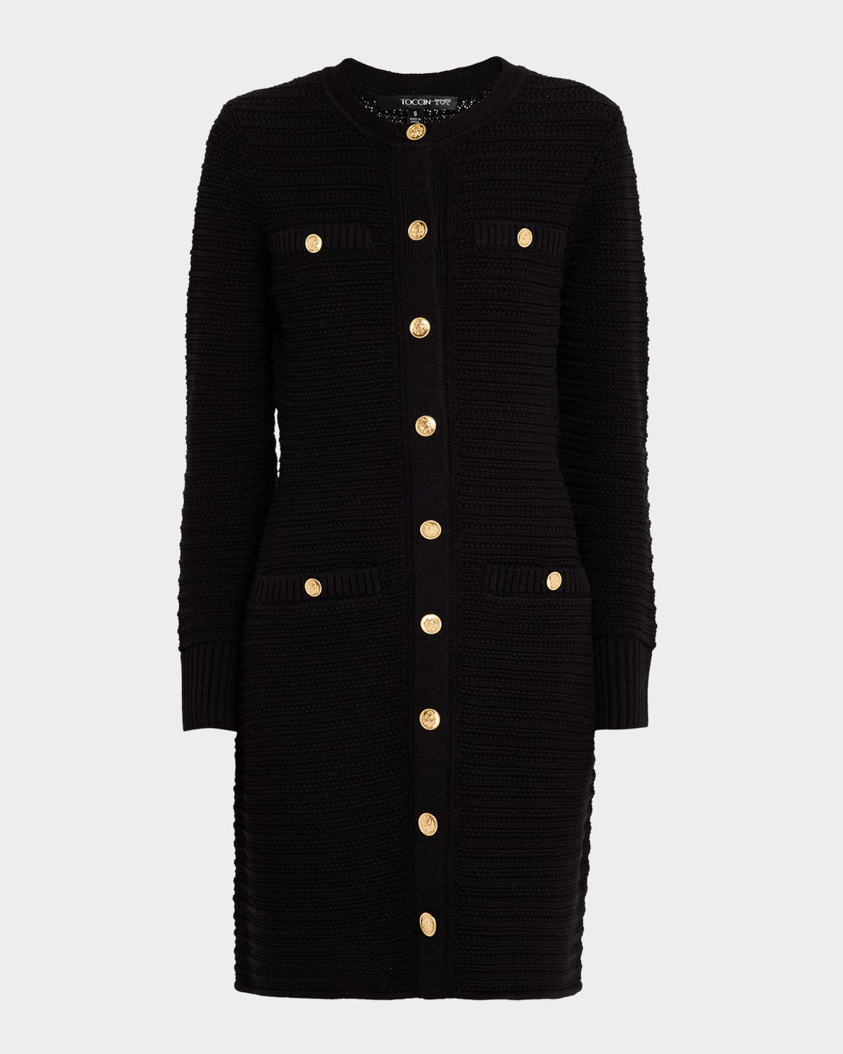 Perfectly tailored for a flattering, figureskimming fit, the "Darla" dress by Toccin is crafted from a luxe textured knit with golden embosseddome buttons Approx. 18.3"L from shoulder to hem Crew neckline Long sleeves Front buttoned welt pockets Hem falls above the knee Sheath silhouette Button front closure Cotton Hand wash or dry clean Imported