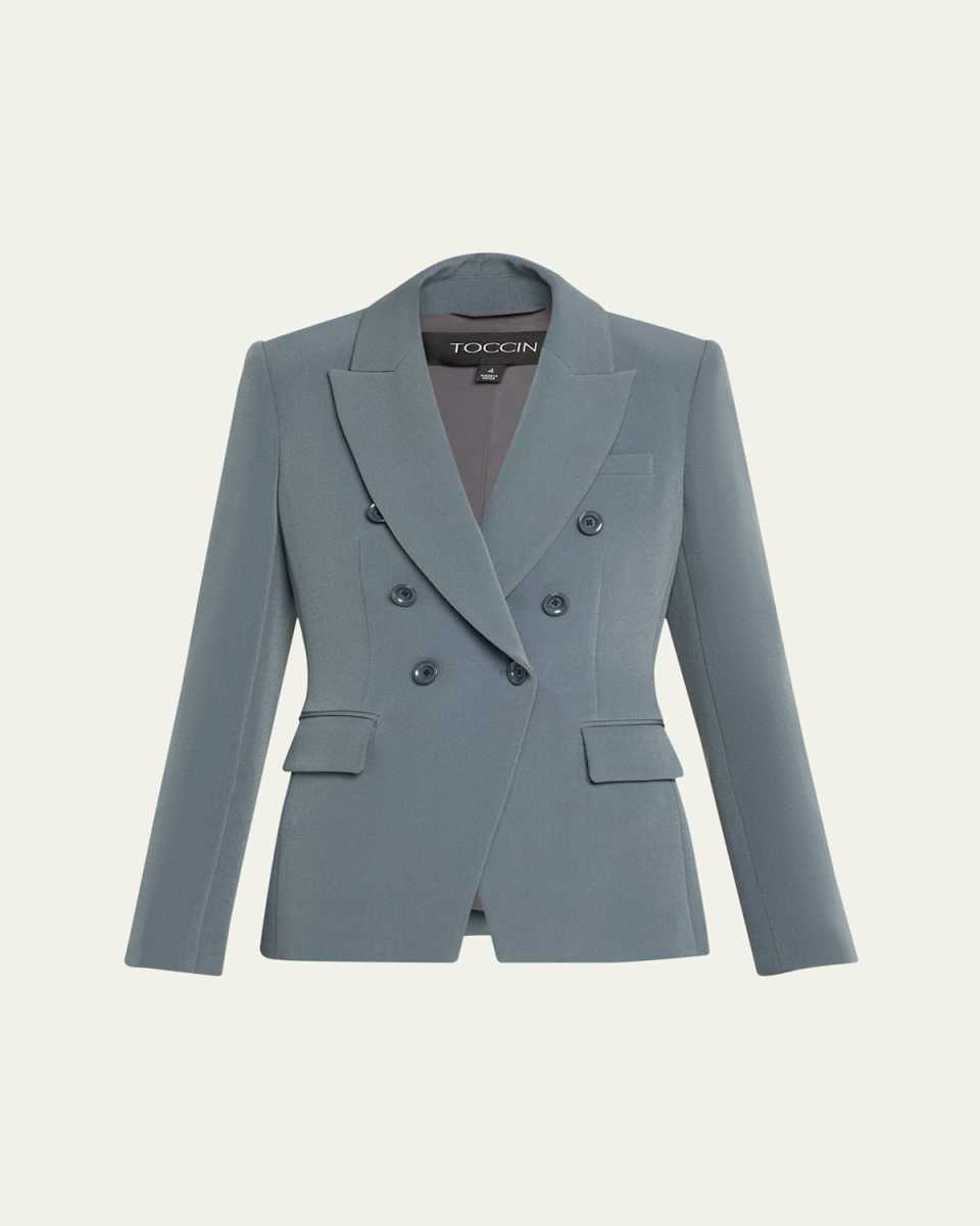 Toccin "Kylie" solid blazer in a classic tailored silhouette Approx. 30"L from shoulder to hem Peak lapels; doublebreasted front Long sleeves; button cuffs Chest welt pocket Hip flap pockets Centercut back vent Midlength Polyester/elastane Lining: Polyester Dry clean Imported