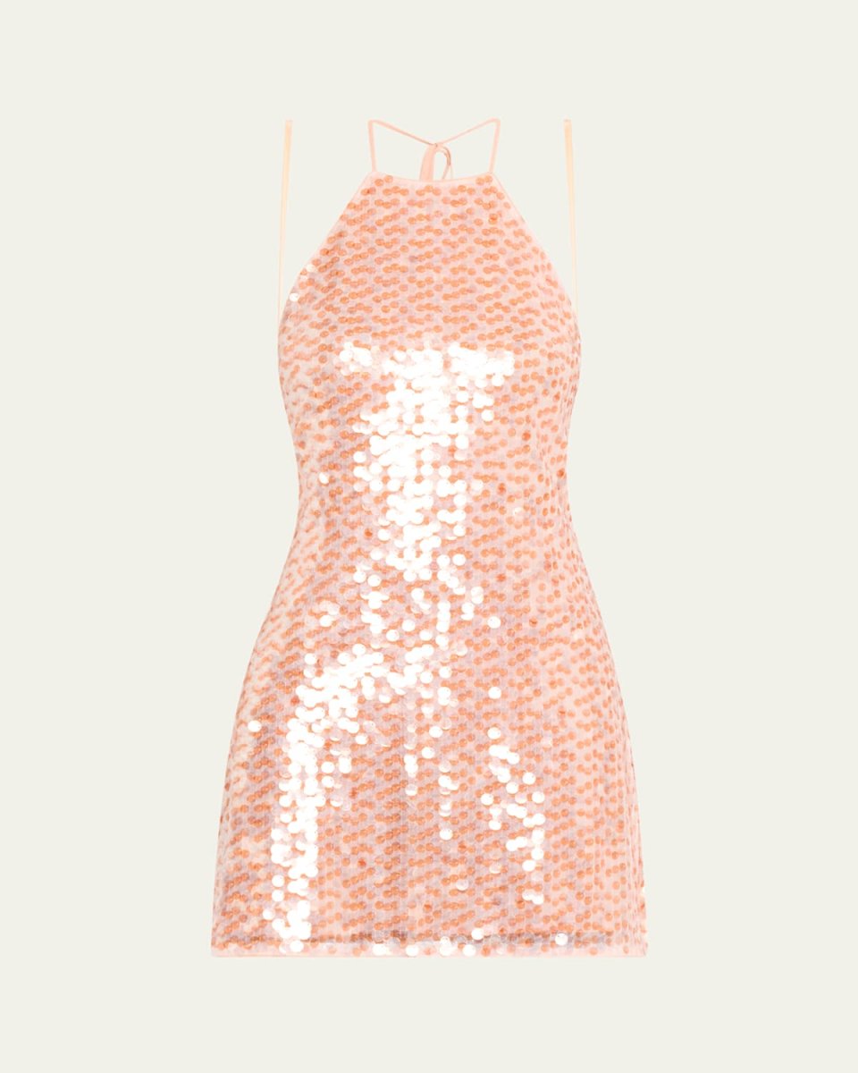 Toccin "Micky" sequinembellished dress Approx. 30.5"L from shoulder to hem Halter neckline; selfties behind the neck Sleeveless Hem falls above the knee Shift silhouette Invisible back zipper Polyester Lining: Polyester Imported