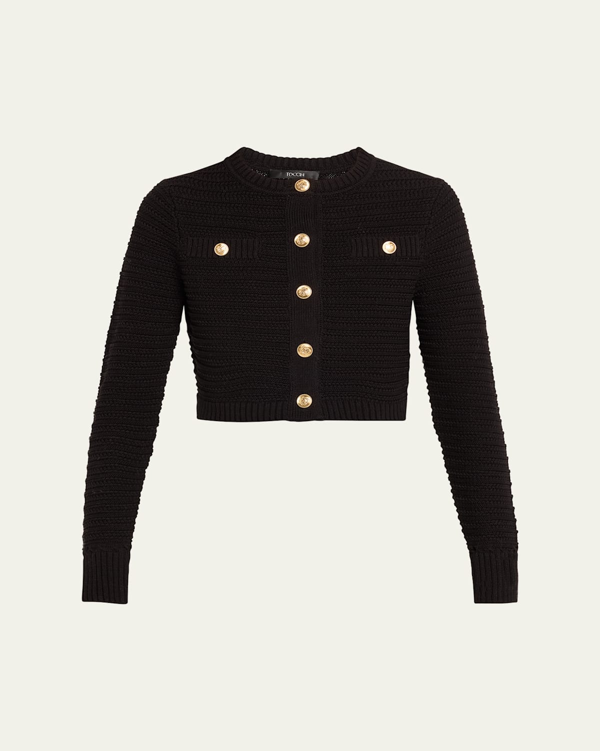 Toccin "Miller" pointelleknit cardigan crafted from mercerized cotton Approx. 16.5"L from shoulder to hem Crew neckline; button front Long sleeves Cropped hem Classic fit Ribbed cuffs and hem Cotton Unlined Imported