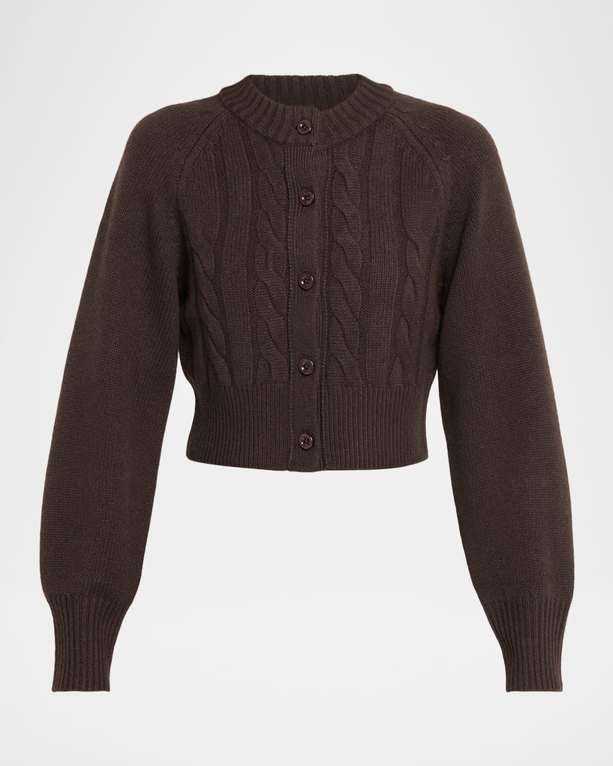 Framed with voluminous sleeves, the "Rita" shrunken cardigan by Toccin is designed with flattering proportions and classic cableknit detailing, offering endless versatility Approx. 17"L from shoulder to hem Crew neckline; button front Long raglan sleeves Slim fit Hip length Ribbed cuffs and hem Wool/cashmere Hand wash or dry clean Imported