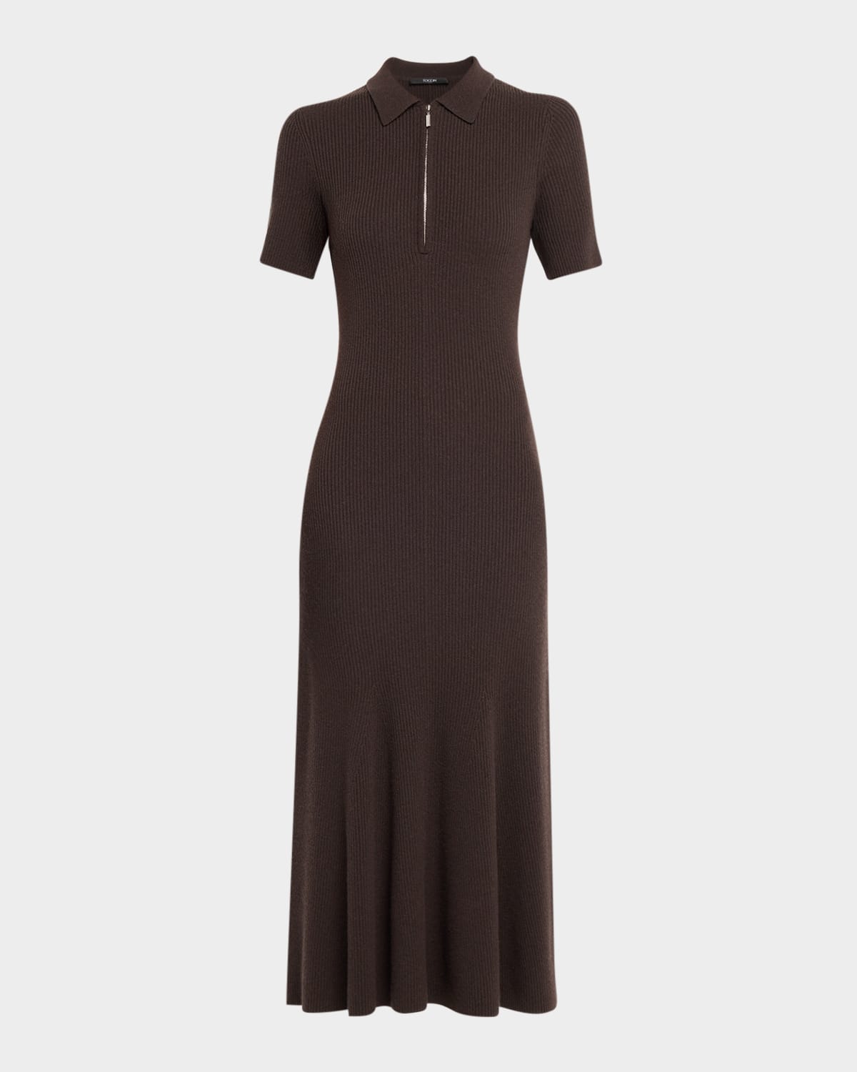 Rendered in a textural ribbed knit construction, the "Taylor" dress by Toccin offers a sporty, yet sophisticated, everyday look Approx. 44"L from shoulder to hem Polo collar; partial zip front Short sleeves Hem falls below the knee Aline silhouette Slipover style Wool/cashmere/spandex Hand wash or dry clean Imported
