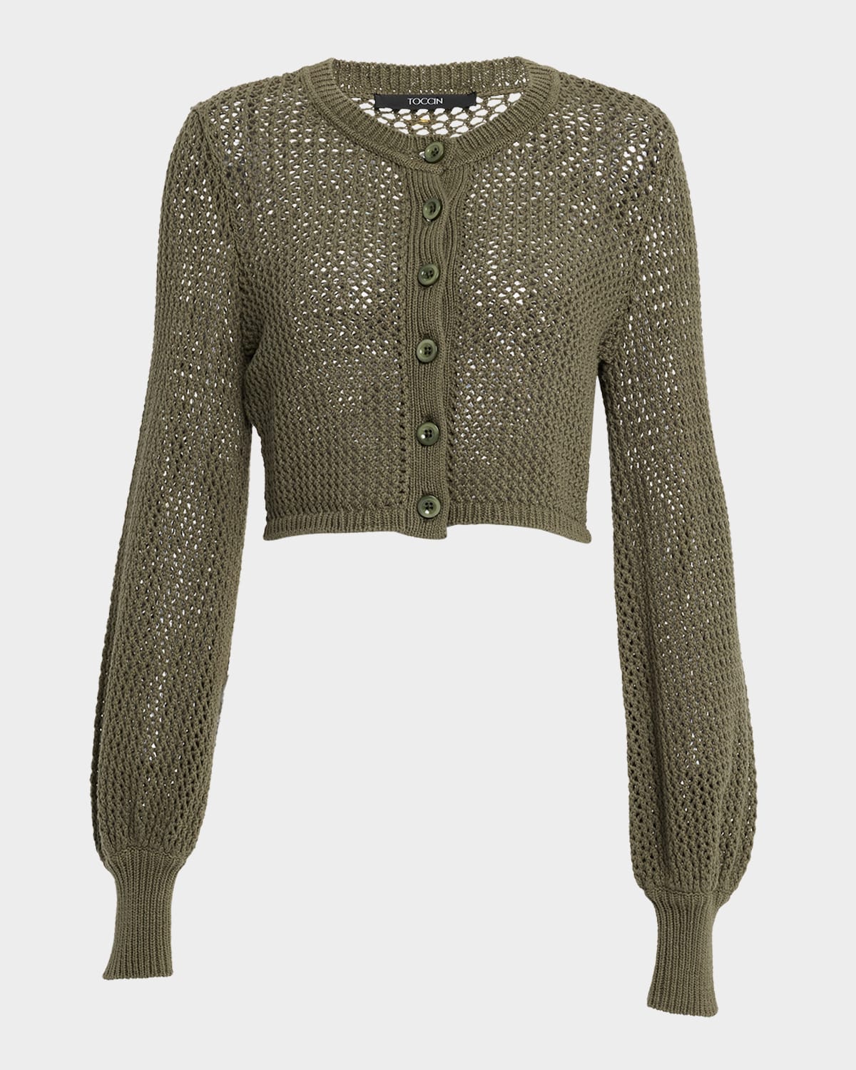 Toccin "Tori" crochetknit cardigan finished with voluminous sleeves and tonal buttons Approx. 16"L from shoulder to hem Crew neckline; button front Long blouson sleeves; ribbed cuffs Relaxed fit Cropped hem Cotton Unlined Dry clean Imported