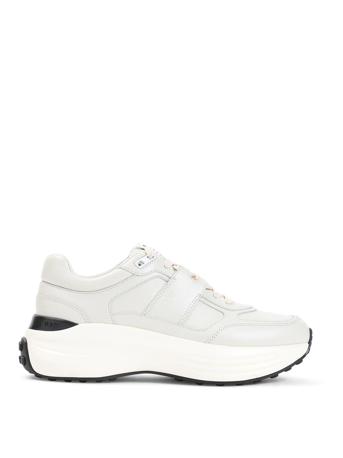 Sneakers Tod's en cuir blanc laiteux. Baskets en cuir blanc pur, bout rond renforcé, fermeture à lacets ton sur ton sur le dessus, logo patch sur la languette, logo noir contrastant sur le côté, semelle en caoutchouc blanc et noir.