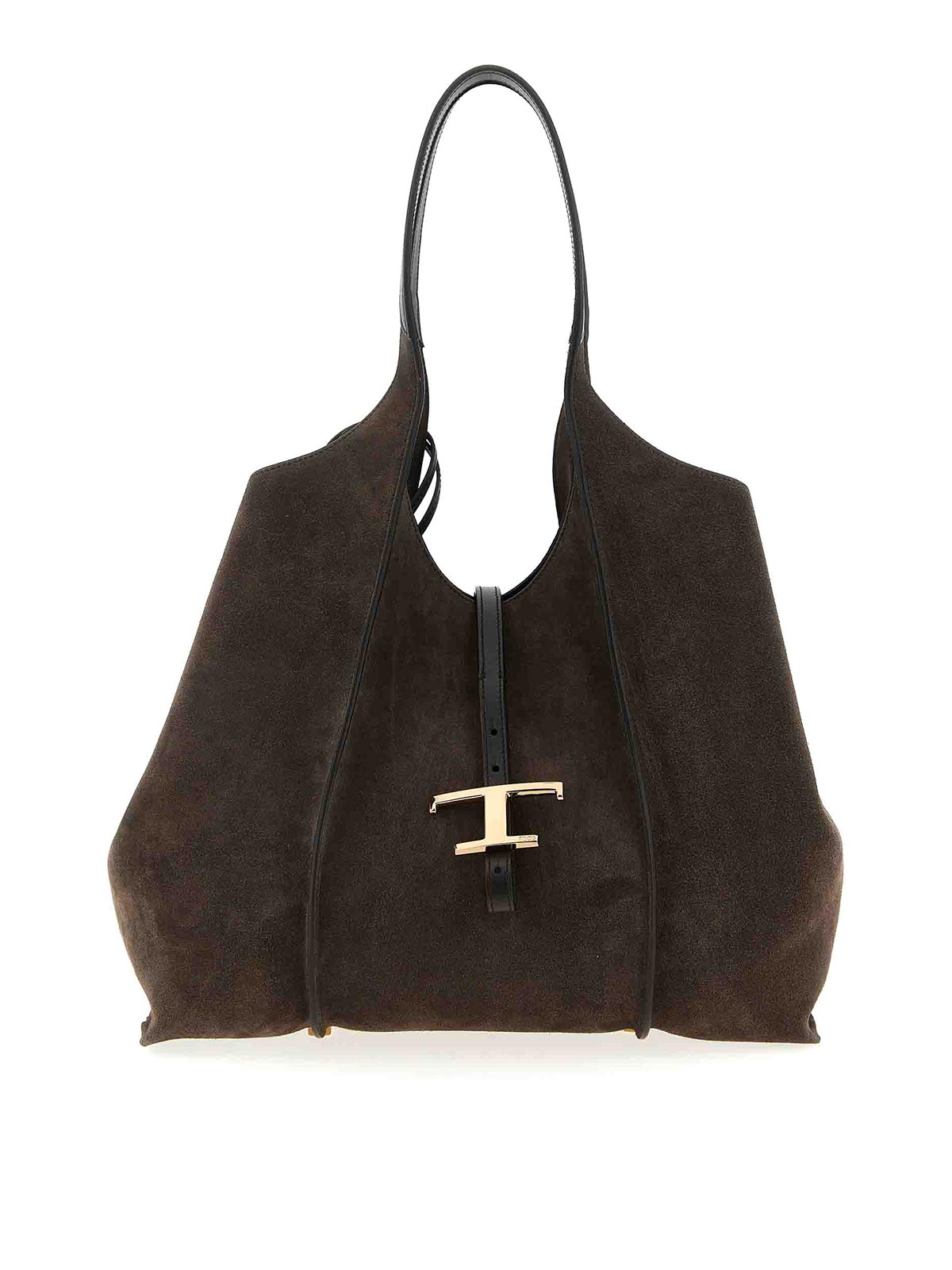 Sac shopping en daim de taille moyenne avec détails en cuir lisse, fermeture à bande et bouton-pression avec détail métallique « intemporel » sur le devant, double poignée fixe, base rigide avec pieds en métal, sangle intérieure pour changer de largeur, porte-clés amovible, pochette intérieure amovible.