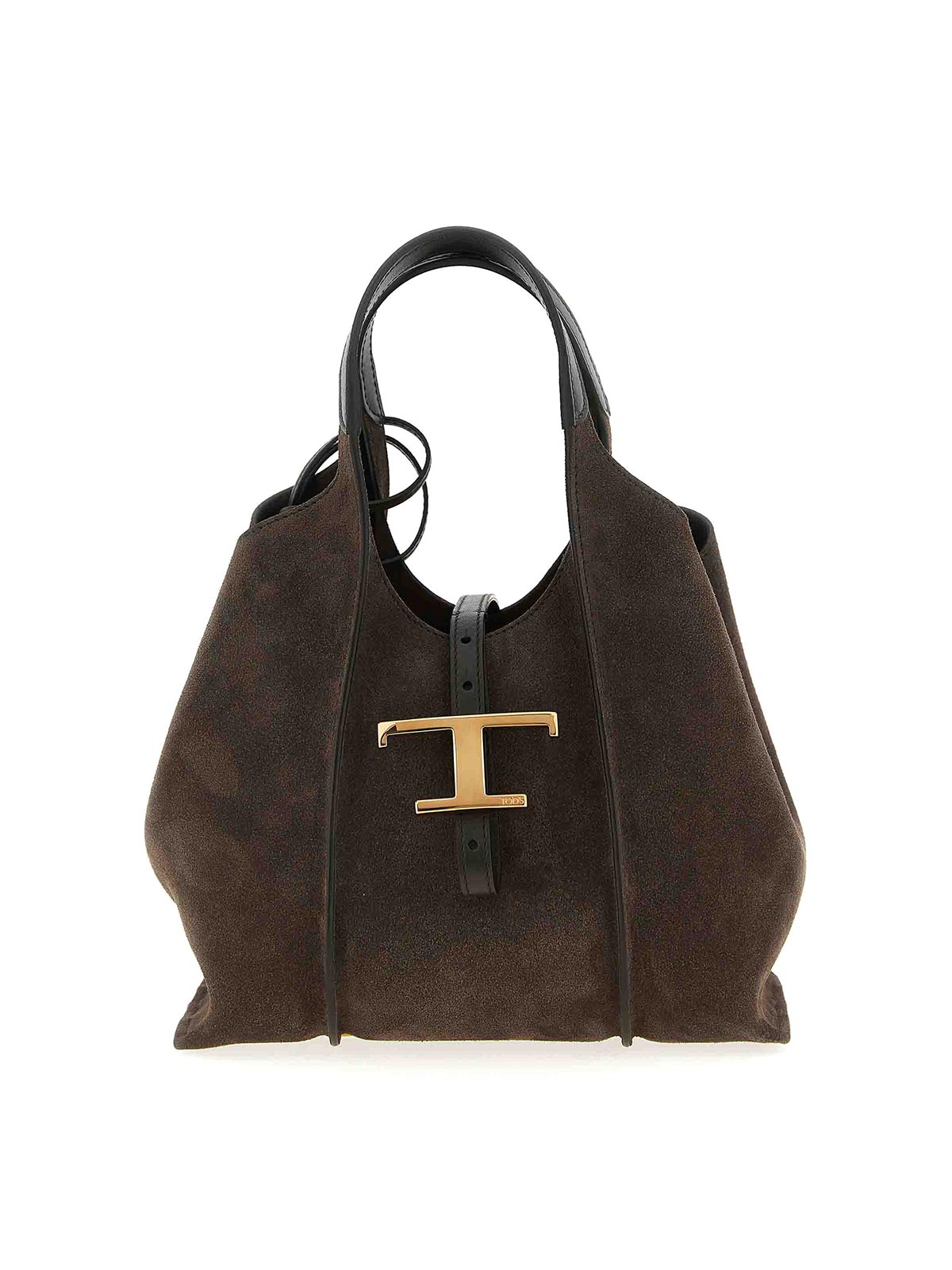 Mini sac shopping en daim avec détails en cuir lisse, fermeture à bande et à bouton-pression avec détail métallique « intemporel » sur le devant, double poignée fixe, base rigide avec pieds en métal, sangle intérieure pour changer de largeur, porte-clés amovible, pochette intérieure amovible, bandoulière réglable et amovible.