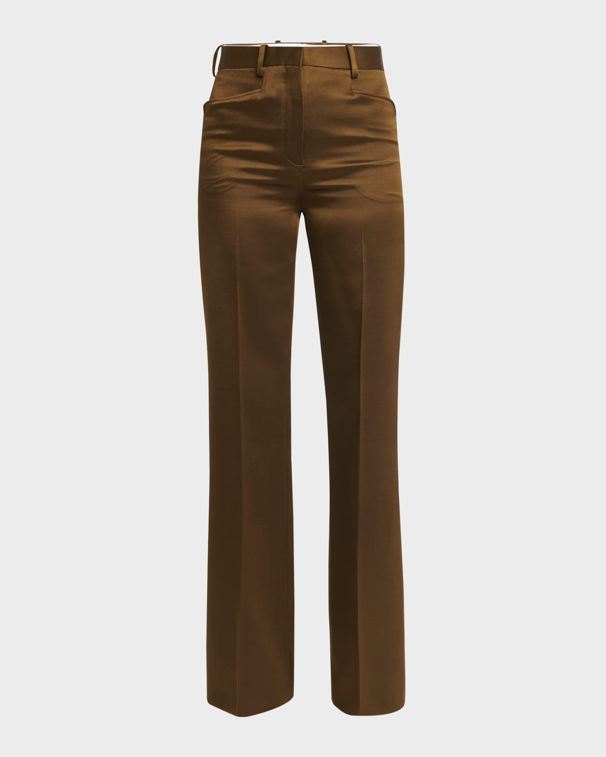 TOM FORD pants in silkblend twill High rise Side slip pockets; back buttonwelt pockets Bootcut legs Full length Hook/zip fly; belt loops Silk/virgin wool Lining: Cupro/silk Imported