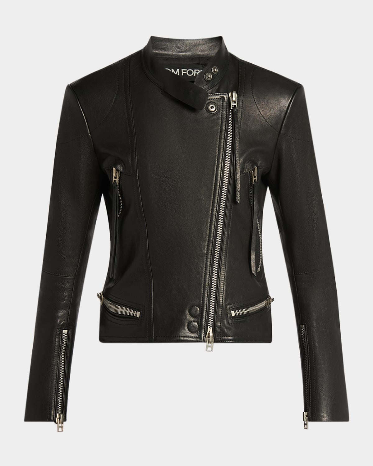 TOM FORD moto jacket in a supple calfskin leather adorned with silvertone zippers Band collar with snap latch; offcenter twoway zip front Long sleeves; zip cuffs Padded shoulders Chest and hip zip pockets Straight fit Hip length Buckle hem Leather Lining: Silk Made in Italy