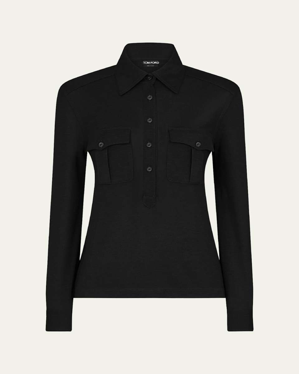TOM FORD militarystyle knit polo top Point collar; halfbutton placket Long sleeves Chest flapbuttoned pockets Relaxed fit Pullover style Viscose/motherofpearl/wool Made in Italy