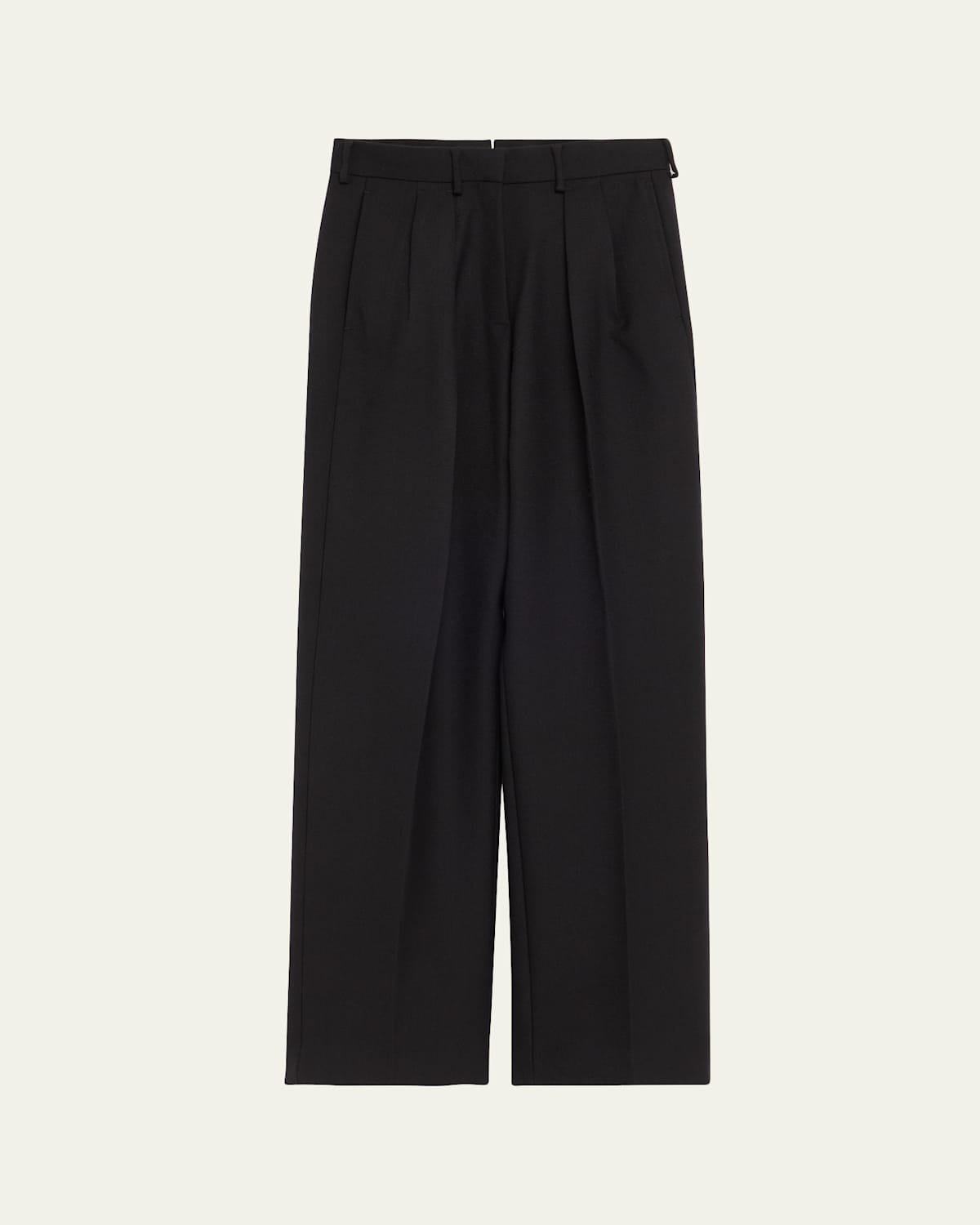 These lowslung woolblend trousers by TOM FORD feature legelongating front and back creases and knee darts High rise Side seam pockets Buttoned back besom pockets Full length Wide legs Hidden hook/zip fly; belt loops Wool/linen/silk Made in Italy