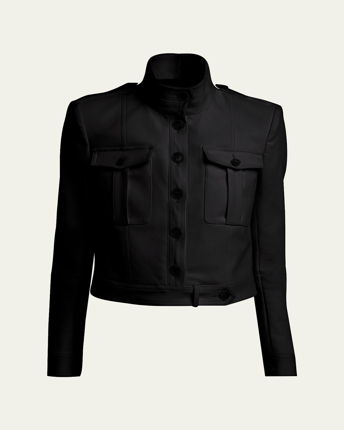 TOM FORD shrunken military cotton jacket with front buttonflap pockets and shoulder epaulets Stand collar; button front Long sleeves; buttontab cuffs Slim fit Hip length Buttontab hem Cotton/elastane/viscose Lining: Cupro Made in Italy