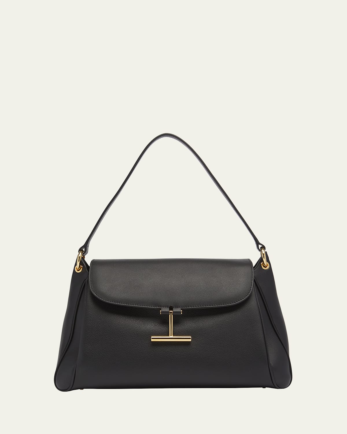 TOM FORD "Tara" shoulder bag in grain leather and polyurethane Shoulder strap Detachable, adjustable crossbody strap Can be worn as a shoulder or crossbody bag Flap top with T bar magnetic closure Exterior, back slip pocket Divided interior Feet protect bottom of bag Approx. 6.3"H x 10.2"W x 3.5"D Made in Italy