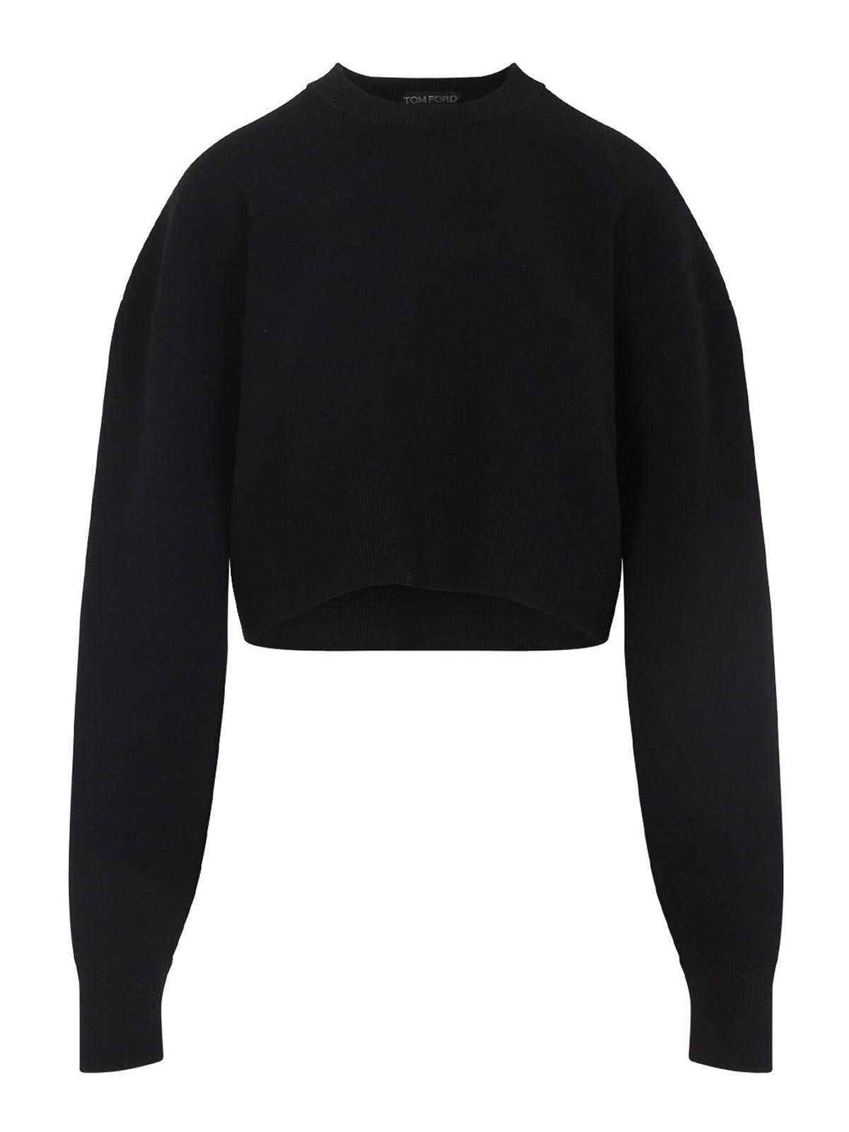 Top Tom Ford en tricot noir confectionné et mélangé, col rond, épaules tombantes, manches longues, poignets côtelés, ourlet asymétrique, design court
