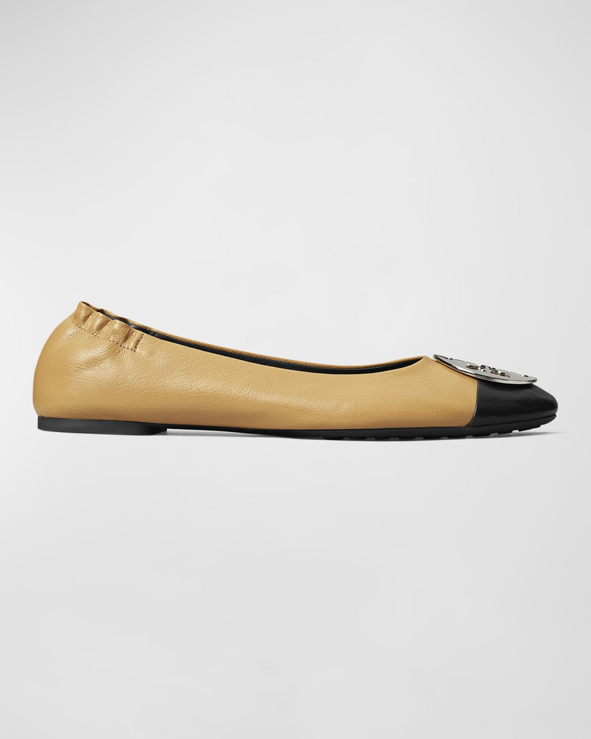 Tory Burch "Claire" twotone leather ballerina flats with logo medallion and bow accent Round cap toe Slipon style Leather outsole Lining: Leather Imported