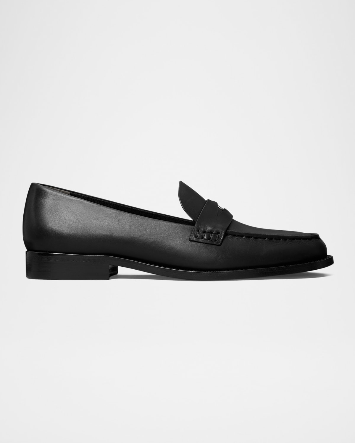 These refined, classic penny loafers by Tory Burch are done in calf leather for a clean, polished look with a logo coin beneath the handstitched strap Tory Burch Stacked flat heel Round moc toe Notched vamp with keeper strap Slipon style Napa leather lining Cushioned leather footbed Buffed leather sole Imported